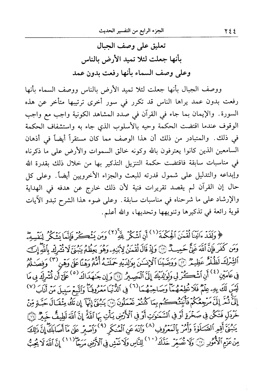 ووصف الجبال بأنها جعلت لئلا تميد الأرض بالناس ووصف السماء بأنها رفعت بدون عمد يراها الناس قد تكرر في سور أخرى ترتيبها متأخر عن هذه السورة. والإيمان بما جاء في القرآن في صدد المشاهد الكونية واجب مع واجب الوقوف عند ما اقتضت الحكمة وحيه بالأسلوب الذي جاء به واستشفاف الحكمة في ذلك. والمتبادر من ذلك أن هذا الوصف مما كان مستقرا أيضا في أذهان السامعين الذين كانوا يعترفون بالله وكونه خالق السموات والأرض على ما ذكرناه في مناسبات سابقة فاقتضت حكمة التنزيل التذكير بها من خلال ذلك بقدرة الله وإبداعه والتدليل على شمول قدرته للبعث والجزاء الأخرويين أيضا. وعلى كل حال إن القرآن لم يقصد تقريرات فنية لأن ذلك خارج عن هدفه في الهداية والإرشاد على ما شرحناه في مناسبات سابقة. وعلى ضوء هذا الشرح تبدو الآيات قوية رائعة في تذكيرها وتنويهها وتحديها، والله أعلم.