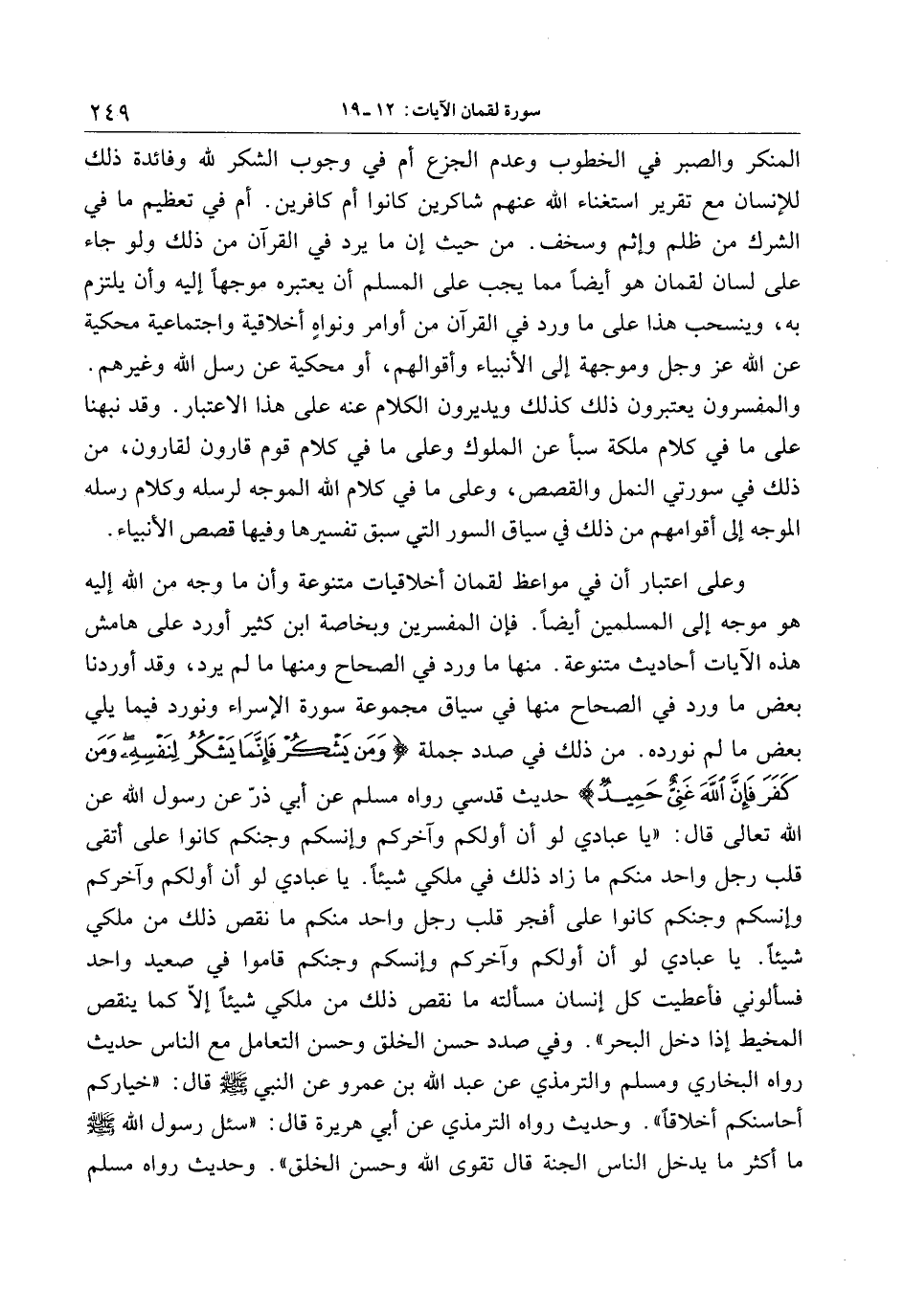 وعلى اعتبار أن في مواعظ لقمان أخلاقيات متنوعة وأن ما وجه من الله إليه هو موجه إلى المسلمين أيضا. فإن المفسرين وبخاصة ابن كثير أورد على هامش هذه الآيات أحاديث متنوعة. منها ما ورد في الصحاح ومنها ما لم يرد، وقد أوردنا بعض ما ورد في الصحاح منها في سياق مجموعة سورة الإسراء ونورد فيما يلي بعض ما لم نورده. من ذلك في صدد جملة وَمَنْ يَشْكُرْ فَإِنَّما يَشْكُرُ لِنَفْسِهِ وَمَنْ كَفَرَ فَإِنَّ اللَّهَ غَنِيٌّ حَمِيدٌ حديث قدسي رواه مسلم عن أبي ذرّ عن رسول الله عن الله تعالى قال: «يا عبادي لو أن أولكم وآخركم وإنسكم وجنكم كانوا على أتقى قلب رجل واحد منكم ما زاد ذلك في ملكي شيئا. يا عبادي لو أن أولكم وآخركم وإنسكم وجنكم كانوا على أفجر قلب رجل واحد منكم ما نقص ذلك من ملكي شيئا. يا عبادي لو أن أولكم وآخركم وإنسكم وجنكم قاموا في صعيد واحد فسألوني فأعطيت كل إنسان مسألته ما نقص ذلك من ملكي شيئا إلّا كما ينقص المخيط إذا دخل البحر» . وفي صدد حسن الخلق وحسن التعامل مع الناس حديث رواه البخاري ومسلم والترمذي عن عبد الله بن عمرو عن النبي صلى الله عليه وسلم قال: «خياركم أحاسنكم أخلاقا» . وحديث رواه الترمذي عن أبي هريرة قال: «سئل رسول الله صلى الله عليه وسلم ما أكثر ما يدخل الناس الجنة قال تقوى الله وحسن الخلق» . وحديث رواه مسلم