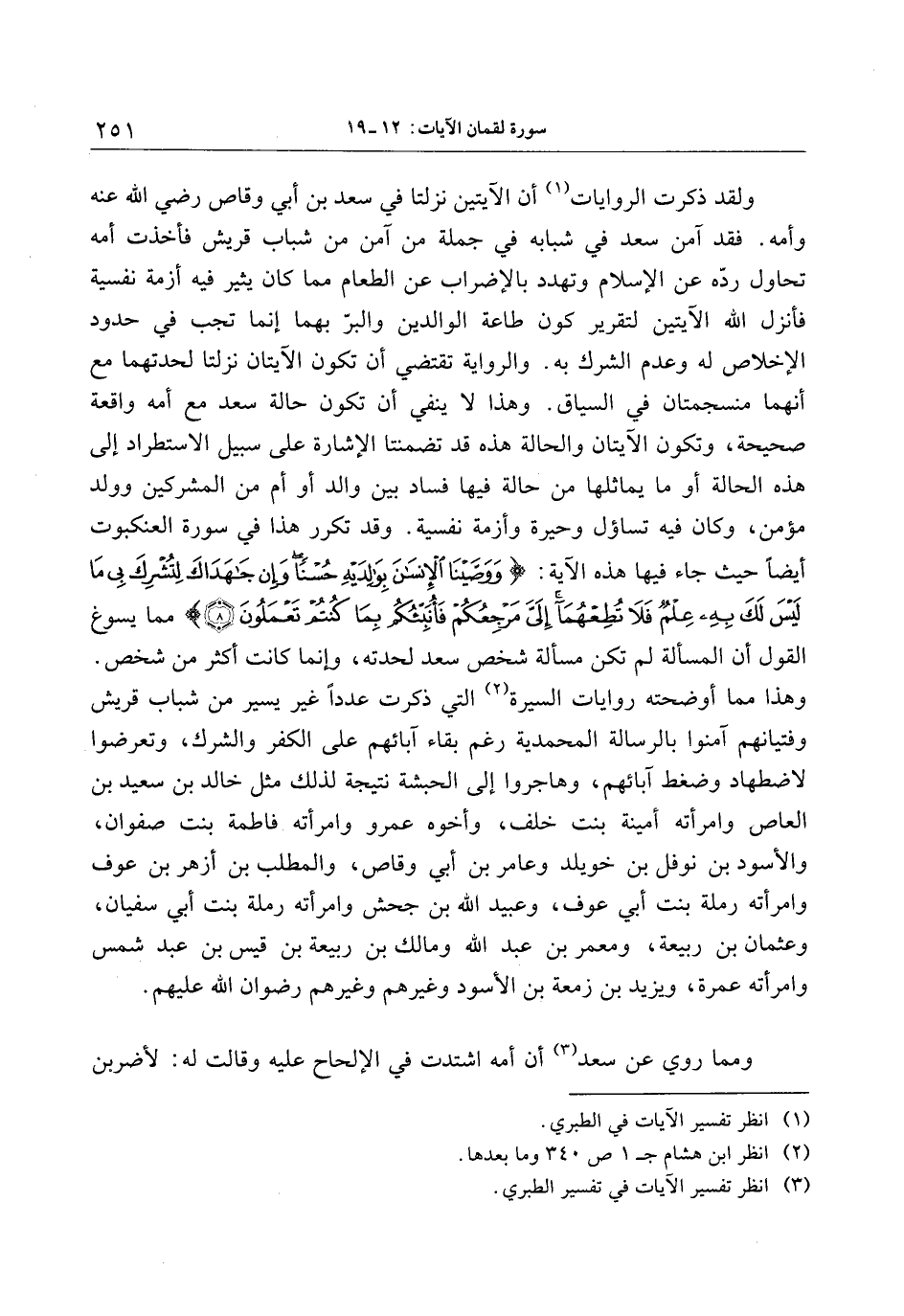 ولقد ذكرت الروايات «1» أن الآيتين نزلنا في سعد بن أبي وقاص رضي الله عنه وأمه. فقد آمن سعد في شبابه في جملة من آمن من شباب قريش فأخذت أمه تحاول ردّه عن الإسلام وتهدد بالإضراب عن الطعام مما كان يثير فيه أزمة نفسية فأنزل الله الآيتين لتقرير كون طاعة الوالدين والبرّ بهما إنما تجب في حدود الإخلاص له وعدم الشرك به. والرواية تقتضي أن تكون الآيتان نزلتا لحدتهما مع أنهما منسجمتان في السياق. وهذا لا ينفي أن تكون حالة سعد مع أمه واقعة صحيحة، وتكون الآيتان والحالة هذه قد تضمنتا الإشارة على سبيل الاستطراد إلى هذه الحالة أو ما يماثلها من حالة فيها فساد بين والد أو أم من المشركين وولد مؤمن، وكان فيه تساؤل وحيرة وأزمة نفسية. وقد تكرر هذا في سورة العنكبوت أيضا حيث جاء فيها هذه الآية: وَوَصَّيْنَا الْإِنْسانَ بِوالِدَيْهِ حُسْناً وَإِنْ جاهَداكَ لِتُشْرِكَ بِي ما لَيْسَ لَكَ بِهِ عِلْمٌ فَلا تُطِعْهُما إِلَيَّ مَرْجِعُكُمْ فَأُنَبِّئُكُمْ بِما كُنْتُمْ تَعْمَلُونَ (8) مما يسوغ القول أن المسألة لم تكن مسألة شخص سعد لحدته، وإنما كانت أكثر من شخص.