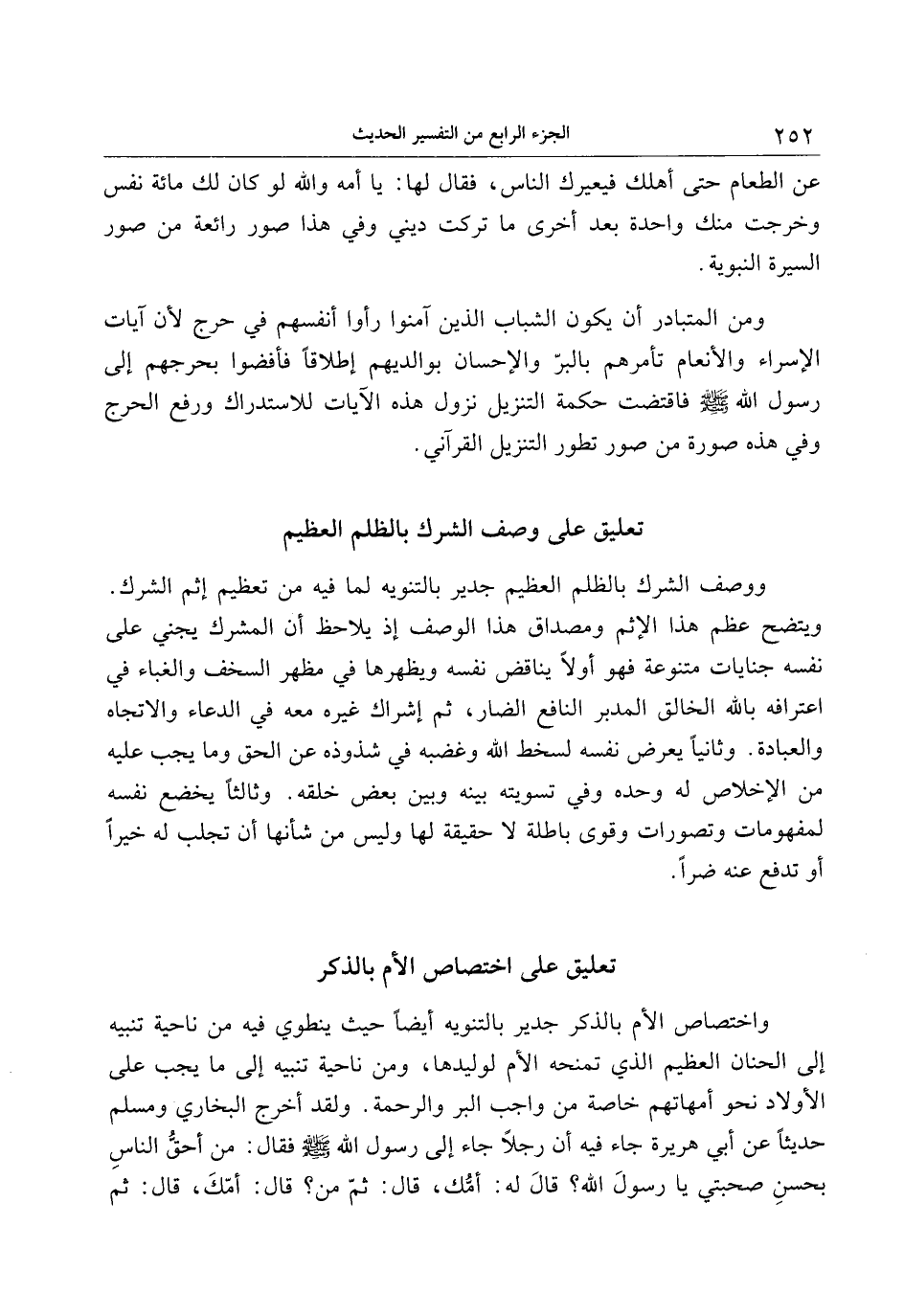ومن المتبادر أن يكون الشباب الذين آمنوا رأوا أنفسهم في حرج لأن آيات الإسراء والأنعام تأمرهم بالبرّ والإحسان بوالديهم إطلاقا فأفضوا بحرجهم إلى رسول الله صلى الله عليه وسلم فاقتضت حكمة التنزيل نزول هذه الآيات للاستدراك ورفع الحرج وفي هذه صورة من صور تطور التنزيل القرآني.