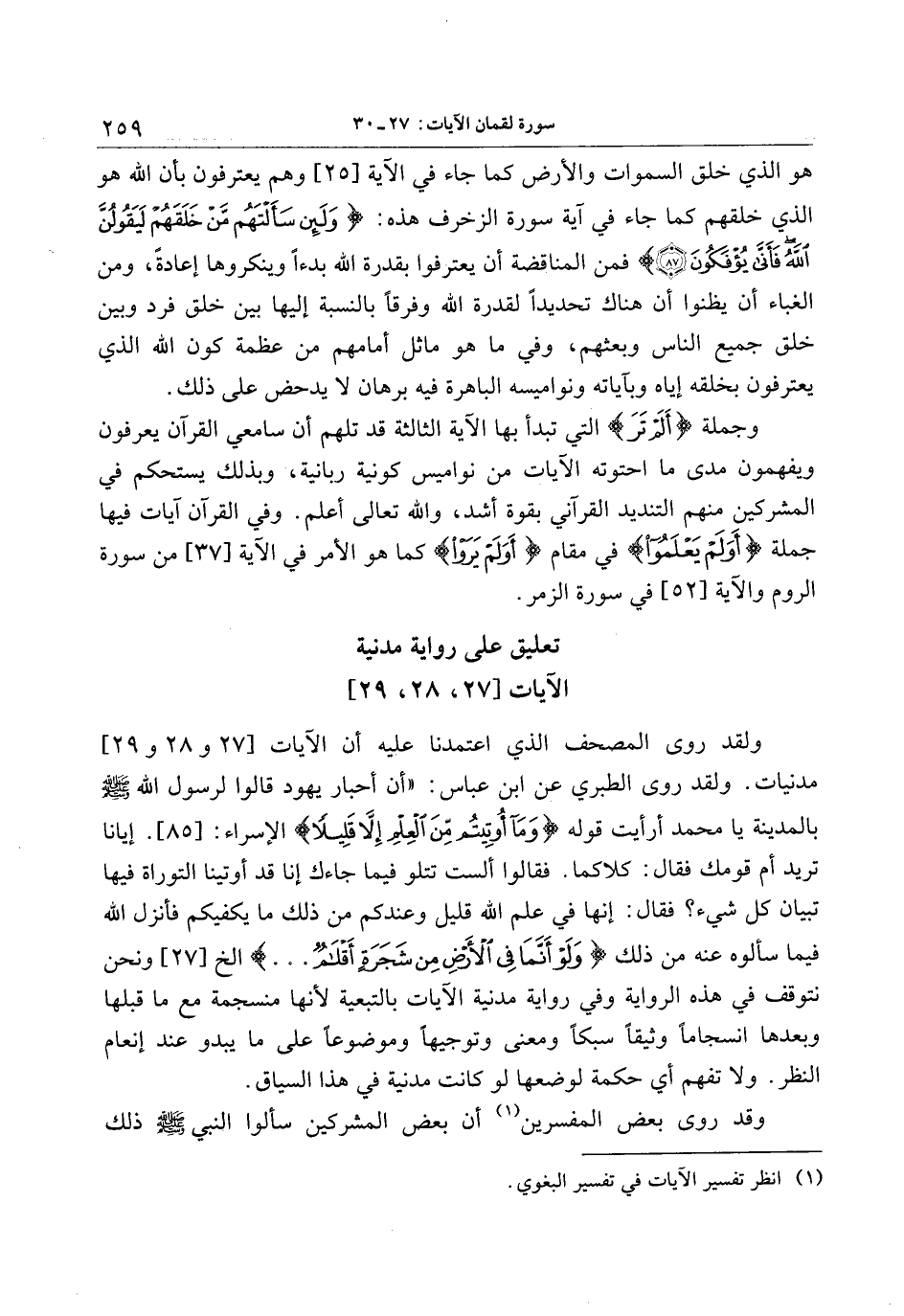ولقد روى المصحف الذي اعتمدنا عليه أن الآيات [27 و 28 و 29] مدنيات. ولقد روى الطبري عن ابن عباس: «أن أحبار يهود قالوا لرسول الله صلى الله عليه وسلم بالمدينة يا محمد أرأيت قوله وَما أُوتِيتُمْ مِنَ الْعِلْمِ إِلَّا قَلِيلًا الإسراء: [85] . إيانا تريد أم قومك فقال: كلاكما. فقالوا ألست تتلو فيما جاءك إنا قد أوتينا التوراة فيها تبيان كل شيء؟ فقال: إنها في علم الله قليل وعندكم من ذلك ما يكفيكم فأنزل الله فيما سألوه عنه من ذلك وَلَوْ أَنَّما فِي الْأَرْضِ مِنْ شَجَرَةٍ أَقْلامٌ ... إلخ [27] ونحن نتوقف في هذه الرواية وفي رواية مدنية الآيات بالتبعية لأنها منسجمة مع ما قبلها وبعدها انسجاما وثيقا سبكا ومعنى وتوجيها وموضوعا على ما يبدو عند إنعام النظر. ولا تفهم أي حكمة لوضعها لو كانت مدنية في هذا السياق.