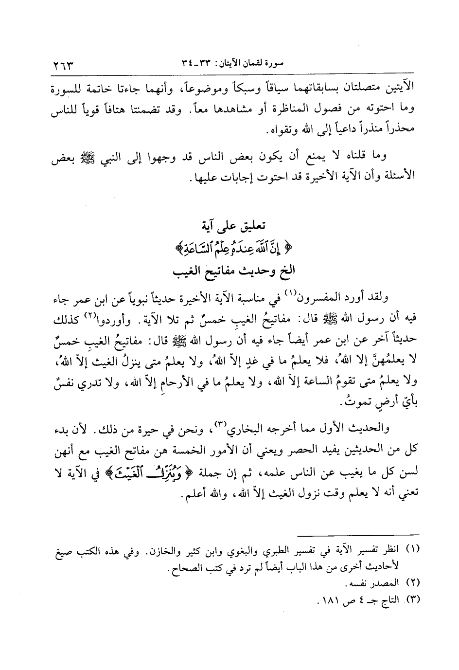 والحديث الأول مما أخرجه البخاري «3» ، ونحن في حيرة من ذلك. لأن بدء كل من الحديثين يفيد الحصر ويعني أن الأمور الخمسة هن مفاتح الغيب مع أنهن لسن كل ما يغيب عن الناس علمه، ثم إن جملة وَيُنَزِّلُ الْغَيْثَ في الآية لا تعني أنه لا يعلم وقت نزول الغيث إلّا الله، والله أعلم.