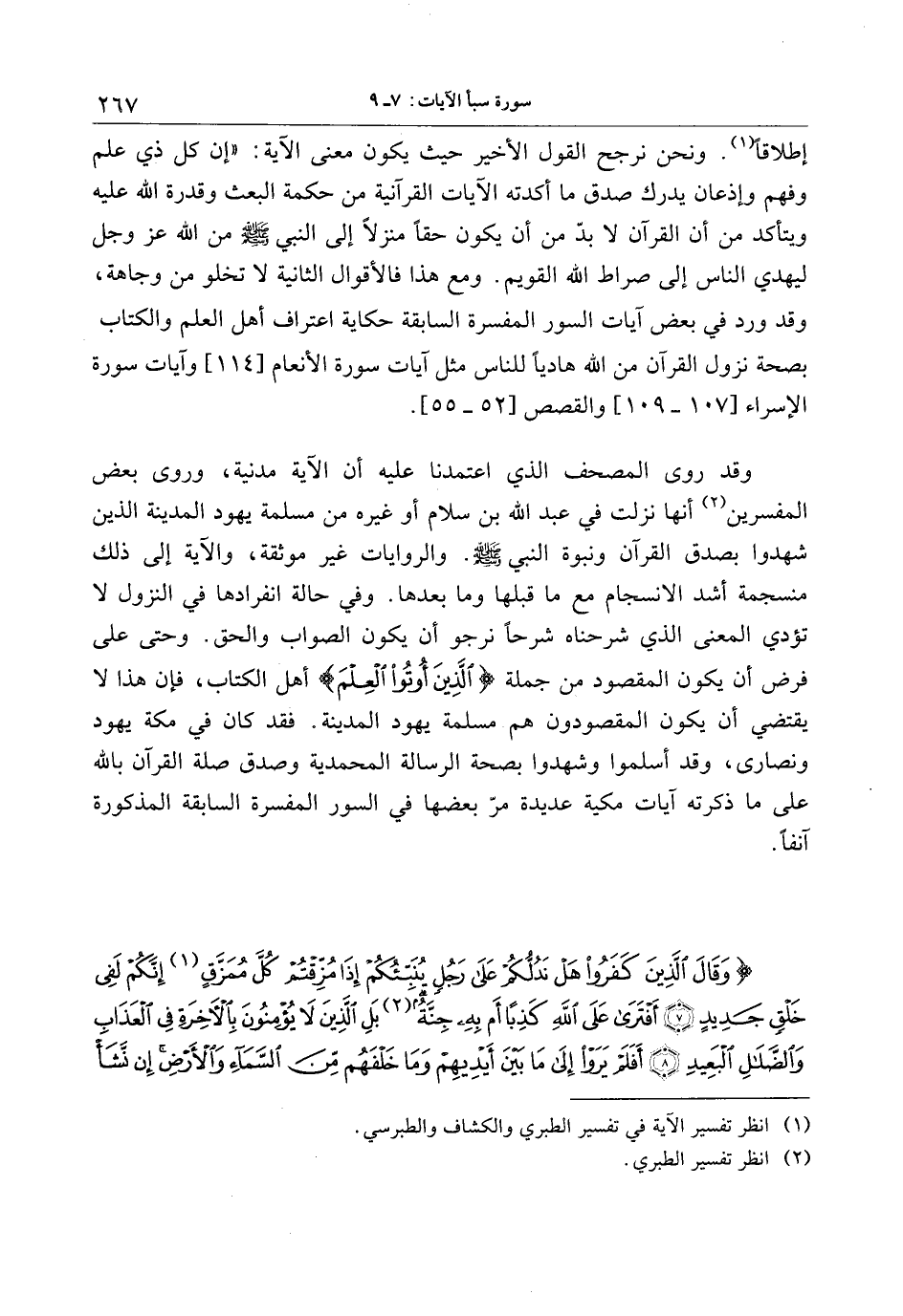 إطلاقا «1» . ونحن نرجح القول الأخير حيث يكون معنى الآية: «إن كل ذي علم وفهم وإذعان يدرك صدق ما أكدته الآيات القرآنية من حكمة البعث وقدرة الله عليه ويتأكد من أن القرآن لا بدّ من أن يكون حقا منزلا إلى النبي صلى الله عليه وسلم من الله عز وجل ليهدي الناس إلى صراط الله القويم. ومع هذا فالأقوال الثانية لا تخلو من وجاهة، وقد ورد في بعض آيات السور المفسرة السابقة حكاية اعتراف أهل العلم والكتاب بصحة نزول القرآن من الله هاديا للناس مثل آيات سورة الأنعام [114] وآيات سورة الإسراء [107- 109] والقصص [52- 55] .