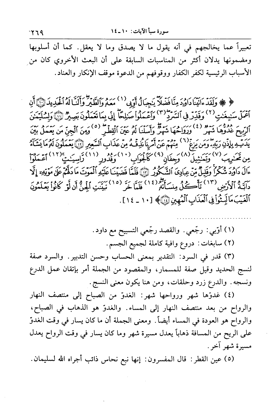 وَلَقَدْ آتَيْنا داوُدَ مِنَّا فَضْلاً يا جِبالُ أَوِّبِي مَعَهُ وَالطَّيْرَ وَأَلَنَّا لَهُ الْحَدِيدَ (10) أَنِ اعْمَلْ سابِغاتٍ وَقَدِّرْ فِي السَّرْدِ وَاعْمَلُوا صالِحاً إِنِّي بِما تَعْمَلُونَ بَصِيرٌ (11) وَلِسُلَيْمانَ الرِّيحَ غُدُوُّها شَهْرٌ وَرَواحُها شَهْرٌ وَأَسَلْنا لَهُ عَيْنَ الْقِطْرِ وَمِنَ الْجِنِّ مَنْ يَعْمَلُ بَيْنَ يَدَيْهِ بِإِذْنِ رَبِّهِ وَمَنْ يَزِغْ مِنْهُمْ عَنْ أَمْرِنا نُذِقْهُ مِنْ عَذابِ السَّعِيرِ (12) يَعْمَلُونَ لَهُ ما يَشاءُ مِنْ مَحارِيبَ وَتَماثِيلَ وَجِفانٍ كَالْجَوابِ وَقُدُورٍ راسِياتٍ اعْمَلُوا آلَ داوُدَ شُكْراً وَقَلِيلٌ مِنْ عِبادِيَ الشَّكُورُ (13) فَلَمَّا قَضَيْنا عَلَيْهِ الْمَوْتَ ما دَلَّهُمْ عَلى مَوْتِهِ إِلاَّ دَابَّةُ الْأَرْضِ تَأْكُلُ مِنْسَأَتَهُ فَلَمَّا خَرَّ تَبَيَّنَتِ الْجِنُّ أَنْ لَوْ كانُوا يَعْلَمُونَ الْغَيْبَ ما لَبِثُوا فِي الْعَذابِ الْمُهِينِ (14)