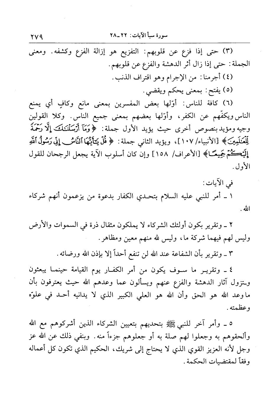 (6) كافة للناس: أوّلها بعض المفسرين بمعنى مانع وكاف أي يمنع الناس ويكفّهم عن الكفر، وأوّلها بعضهم بمعنى جميع الناس. وكلا القولين وجيه ومؤيد بنصوص أخرى حيث يؤيد الأول جملة: وَما أَرْسَلْناكَ إِلَّا رَحْمَةً لِلْعالَمِينَ [الأنبياء/ 107] ، ويؤيد الثاني جملة: قُلْ يا أَيُّهَا النَّاسُ إِنِّي رَسُولُ اللَّهِ إِلَيْكُمْ جَمِيعاً [الأعراف/ 158] وإن كان أسلوب الآية يجعل الرجحان للقول الأول.