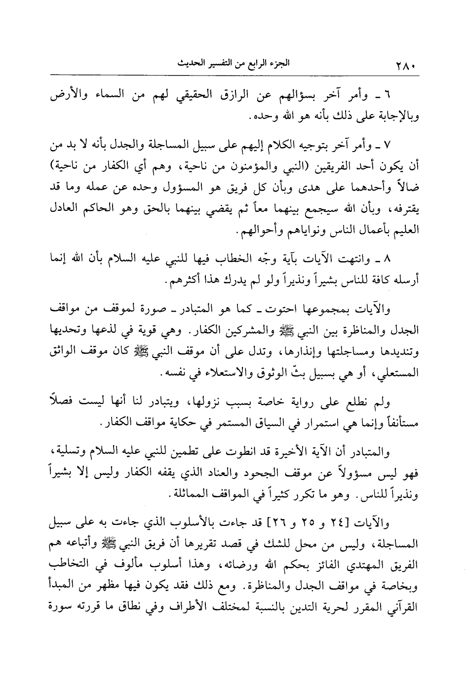 والآيات [24 و 25 و 26] قد جاءت بالأسلوب الذي جاءت به على سبيل المساجلة، وليس من محل للشك في قصد تقريرها أن فريق النبي صلّى الله عليه وسلم وأتباعه هم الفريق المهتدي الفائز بحكم الله ورضائه، وهذا أسلوب مألوف في التخاطب وبخاصة في مواقف الجدل والمناظرة. ومع ذلك فقد يكون فيها مظهر من المبدأ القرآني المقرر لحرية التدين بالنسبة لمختلف الأطراف وفي نطاق ما قررته سورة