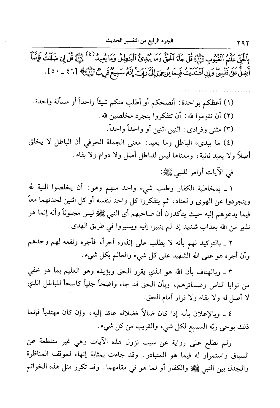 1- بمخاطبة الكفار وطلب شيء واحد منهم وهو: أن يخلصوا النية لله ويتجردوا عن الهوى والعناد، ثم يتفكروا كل واحد لنفسه أو كل اثنين لحدتهما معا فيما يدعوهم إليه حيث يتأكدون أن صاحبهم أي النبي صلى الله عليه وسلم ليس مجنونا وأنه إنما هو نذير من الله بعذاب شديد إذا لم ينيبوا إليه ويسيروا في طريق الهدى.