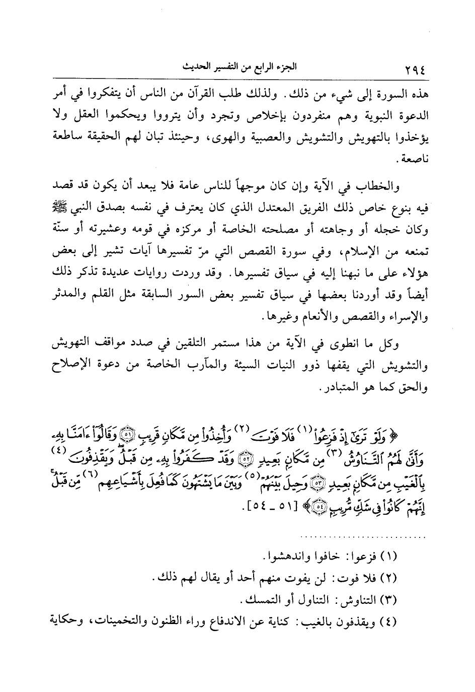 وَلَوْ تَرى إِذْ فَزِعُوا فَلا فَوْتَ وَأُخِذُوا مِنْ مَكانٍ قَرِيبٍ (51) وَقالُوا آمَنَّا بِهِ وَأَنَّى لَهُمُ التَّناوُشُ مِنْ مَكانٍ بَعِيدٍ (52) وَقَدْ كَفَرُوا بِهِ مِنْ قَبْلُ وَيَقْذِفُونَ بِالْغَيْبِ مِنْ مَكانٍ بَعِيدٍ (53) وَحِيلَ بَيْنَهُمْ وَبَيْنَ ما يَشْتَهُونَ كَما فُعِلَ بِأَشْياعِهِمْ مِنْ قَبْلُ إِنَّهُمْ كانُوا فِي شَكٍّ مُرِيبٍ (54)