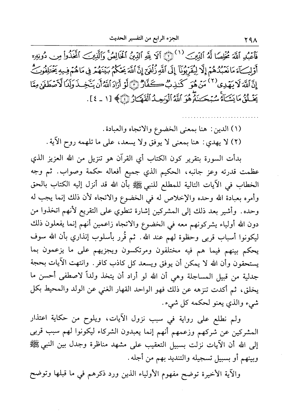 بدأت السورة بتقرير كون الكتاب أي القرآن هو تنزيل من الله العزيز الذي عظمت قدرته وعز جانبه، الحكيم الذي جميع أفعاله حكمة وصواب. ثم وجه الخطاب في الآيات التالية للمطلع للنبي صلى الله عليه وسلم بأن الله قد أنزل إليه الكتاب بالحق وأمره بعبادة الله وحده والإخلاص له في الخضوع والاتجاه لأن ذلك إنما يجب له وحده. وأشير بعد ذلك إلى المشركين إشارة تنطوي على التقريع لأنهم اتخذوا من دون الله أولياء يشركونهم معه في الخضوع والاتجاه زاعمين أنهم إنما يفعلون ذلك ليكونوا أسباب قربى وحظوة لهم عند الله. ثم قرر بأسلوب إنذاري بأن الله سوف يحكم بينهم فيما هم فيه مختلفون ومرتكسون ويجزيهم على ما يزعمون بما يستحقون وأن الله لا يمكن أن يوفق ويسعد كل كاذب كافر. وانتهت الآيات بحجة جدلية من قبيل المساجلة وهي أن الله لو أراد أن يتخذ ولدا لاصطفى أحسن ما يخلق، ثم أكدت تنزهه عن ذلك فهو الواحد القهار الغني عن الولد والمحيط بكل شيء والذي يعنو لحكمه كل شيء.