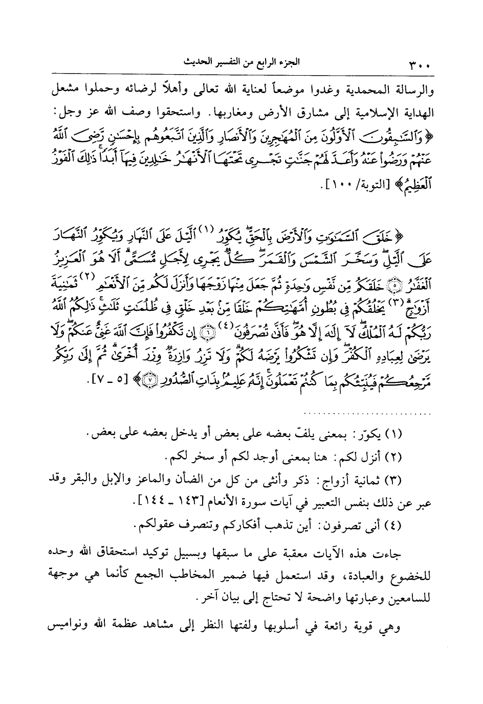 خَلَقَ السَّماواتِ وَالْأَرْضَ بِالْحَقِّ يُكَوِّرُ اللَّيْلَ عَلَى النَّهارِ وَيُكَوِّرُ النَّهارَ عَلَى اللَّيْلِ وَسَخَّرَ الشَّمْسَ وَالْقَمَرَ كُلٌّ يَجْرِي لِأَجَلٍ مُسَمًّى أَلا هُوَ الْعَزِيزُ الْغَفَّارُ (5) خَلَقَكُمْ مِنْ نَفْسٍ واحِدَةٍ ثُمَّ جَعَلَ مِنْها زَوْجَها وَأَنْزَلَ لَكُمْ مِنَ الْأَنْعامِ ثَمانِيَةَ أَزْواجٍ يَخْلُقُكُمْ فِي بُطُونِ أُمَّهاتِكُمْ خَلْقاً مِنْ بَعْدِ خَلْقٍ فِي ظُلُماتٍ ثَلاثٍ ذلِكُمُ اللَّهُ رَبُّكُمْ لَهُ الْمُلْكُ لا إِلهَ إِلاَّ هُوَ فَأَنَّى تُصْرَفُونَ (6) إِنْ تَكْفُرُوا فَإِنَّ اللَّهَ غَنِيٌّ عَنْكُمْ وَلا يَرْضى لِعِبادِهِ الْكُفْرَ وَإِنْ تَشْكُرُوا يَرْضَهُ لَكُمْ وَلا تَزِرُ وازِرَةٌ وِزْرَ أُخْرى ثُمَّ إِلى رَبِّكُمْ مَرْجِعُكُمْ فَيُنَبِّئُكُمْ بِما كُنْتُمْ تَعْمَلُونَ إِنَّهُ عَلِيمٌ بِذاتِ الصُّدُورِ (7)
