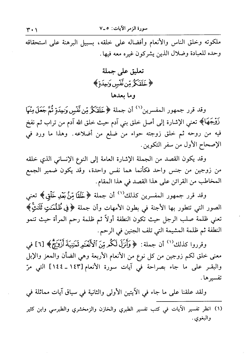 وقد قرر جمهور المفسرين «1» أن جملة خَلَقَكُمْ مِنْ نَفْسٍ واحِدَةٍ ثُمَّ جَعَلَ مِنْها زَوْجَها تعني الإشارة إلى أصل خلق بني آدم حيث خلق الله آدم من تراب ثم نفخ فيه من روحه ثم خلق زوجته حواء من ضلع من أضلاعه. وهذا ما ورد في الإصحاح الأول من سفر التكوين.