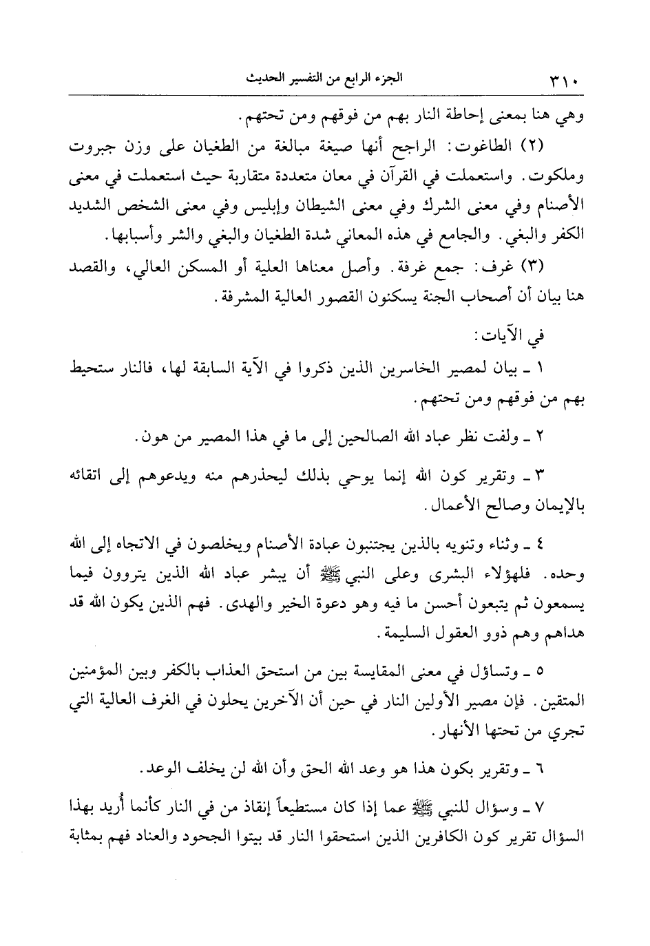 5- وتساؤل في معنى المقايسة بين من استحق العذاب بالكفر وبين المؤمنين المتقين. فإن مصير الأولين النار في حين أن الآخرين يحلون في الغرف العالية التي تجري من تحتها الأنهار.