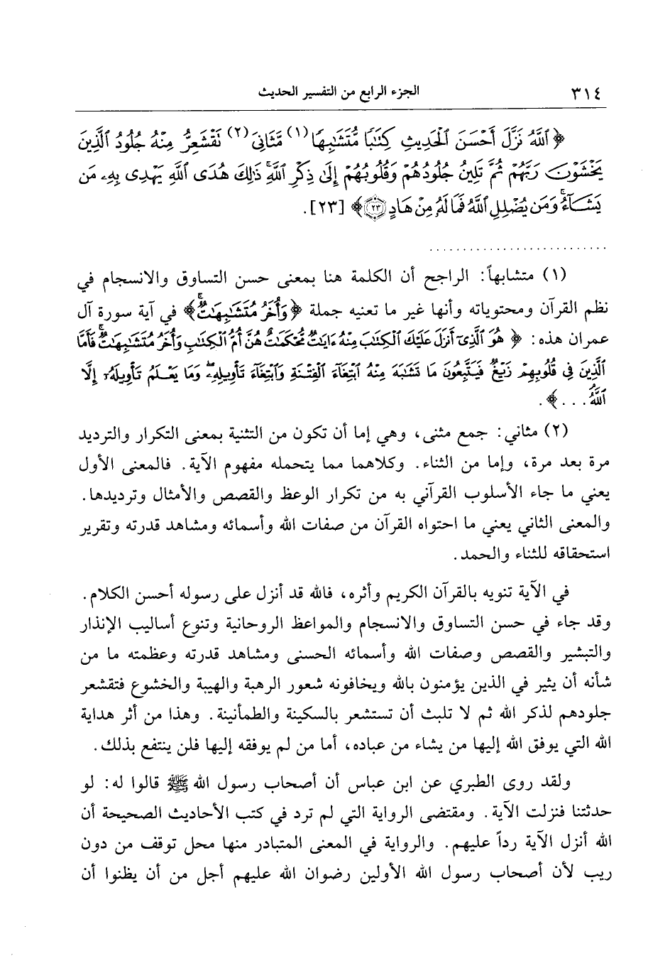 . (1) متشابها: الراجح أن الكلمة هنا بمعنى حسن التساوق والانسجام في نظم القرآن ومحتوياته وأنها غير ما تعنيه جملة وَأُخَرُ مُتَشابِهاتٌ في آية سورة آل عمران هذه: هُوَ الَّذِي أَنْزَلَ عَلَيْكَ الْكِتابَ مِنْهُ آياتٌ مُحْكَماتٌ هُنَّ أُمُّ الْكِتابِ وَأُخَرُ مُتَشابِهاتٌ فَأَمَّا الَّذِينَ فِي قُلُوبِهِمْ زَيْغٌ فَيَتَّبِعُونَ ما تَشابَهَ مِنْهُ ابْتِغاءَ الْفِتْنَةِ وَابْتِغاءَ تَأْوِيلِهِ وَما يَعْلَمُ تَأْوِيلَهُ إِلَّا اللَّهُ....