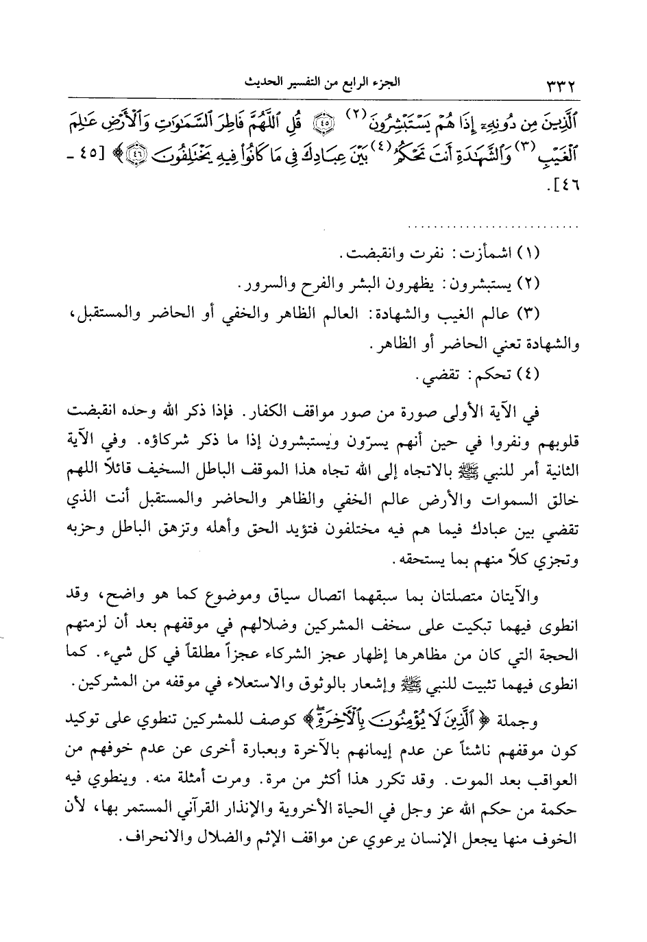 في الآية الأولى صورة من صور مواقف الكفار. فإذا ذكر الله وحده انقبضت قلوبهم ونفروا في حين أنهم يسرّون ويستبشرون إذا ما ذكر شركاؤه. وفي الآية الثانية أمر للنبي صلى الله عليه وسلم بالاتجاه إلى الله تجاه هذا الموقف الباطل السخيف قائلا اللهم خالق السموات والأرض عالم الخفي والظاهر والحاضر والمستقبل أنت الذي تقضي بين عبادك فيما هم فيه مختلفون فتؤيد الحق وأهله وتزهق الباطل وحزبه وتجزي كلا منهم بما يستحقه.