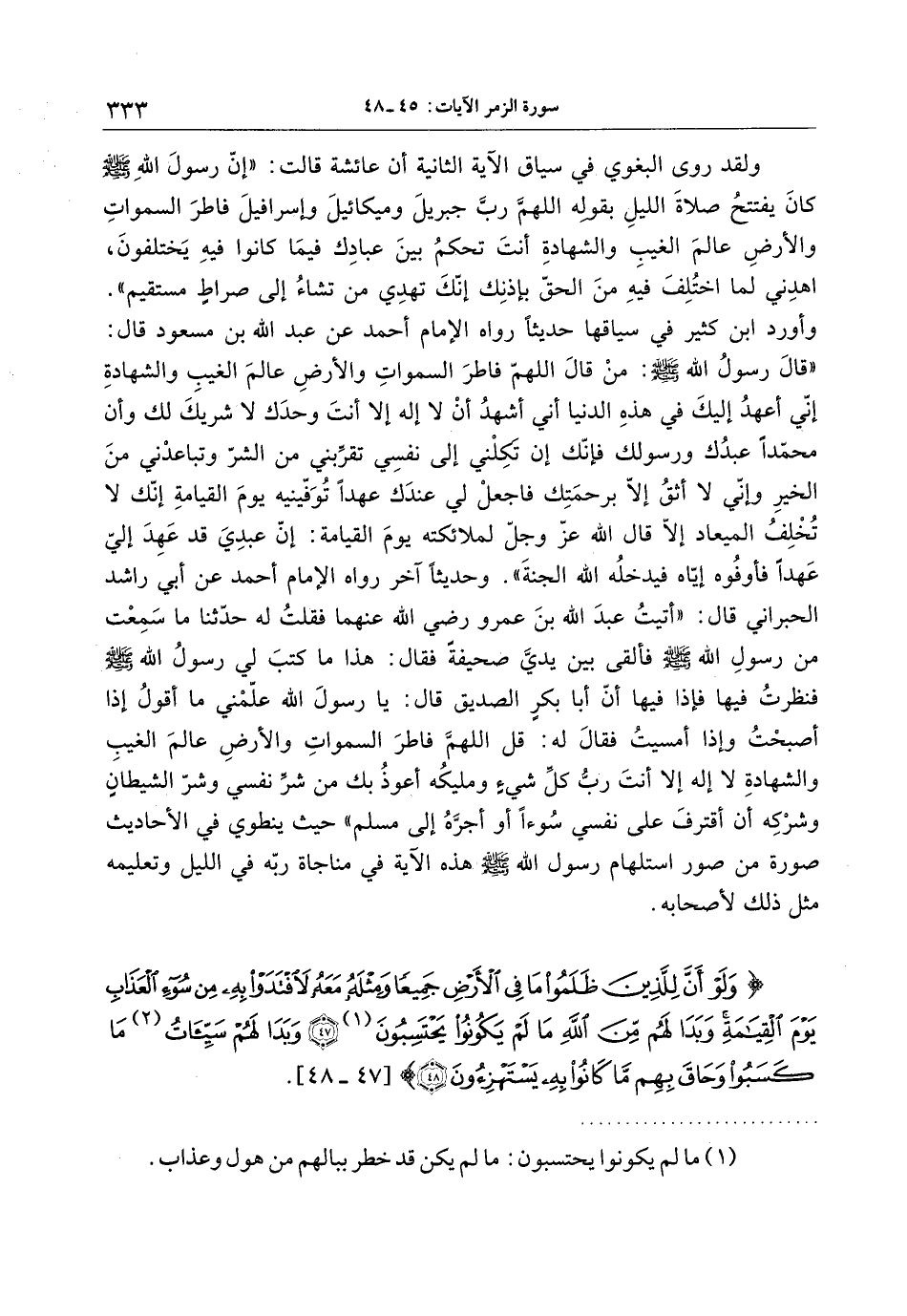 ولقد روى البغوي في سياق الآية الثانية أن عائشة قالت: «إنّ رسول الله صلى الله عليه وسلم كان يفتتح صلاة الليل بقوله اللهمّ ربّ جبريل وميكائيل وإسرافيل فاطر السموات والأرض عالم الغيب والشهادة أنت تحكم بين عبادك فيما كانوا فيه يختلفون، اهدني لما اختلف فيه من الحقّ بإذنك إنّك تهدي من تشاء إلى صراط مستقيم» .