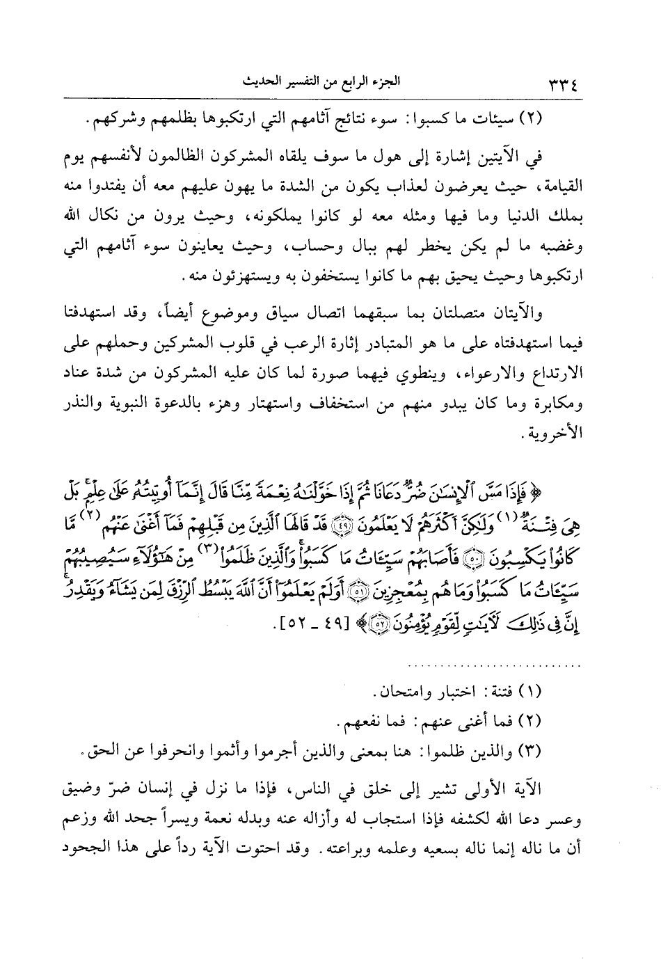 فَإِذا مَسَّ الْإِنْسانَ ضُرٌّ دَعانا ثُمَّ إِذا خَوَّلْناهُ نِعْمَةً مِنَّا قالَ إِنَّما أُوتِيتُهُ عَلى عِلْمٍ بَلْ هِيَ فِتْنَةٌ وَلكِنَّ أَكْثَرَهُمْ لا يَعْلَمُونَ (49) قَدْ قالَهَا الَّذِينَ مِنْ قَبْلِهِمْ فَما أَغْنى عَنْهُمْ ما كانُوا يَكْسِبُونَ (50) فَأَصابَهُمْ سَيِّئاتُ ما كَسَبُوا وَالَّذِينَ ظَلَمُوا مِنْ هؤُلاءِ سَيُصِيبُهُمْ سَيِّئاتُ ما كَسَبُوا وَما هُمْ بِمُعْجِزِينَ (51) أَوَلَمْ يَعْلَمُوا أَنَّ اللَّهَ يَبْسُطُ الرِّزْقَ لِمَنْ يَشاءُ وَيَقْدِرُ إِنَّ فِي ذلِكَ لَآياتٍ لِقَوْمٍ يُؤْمِنُونَ (52)