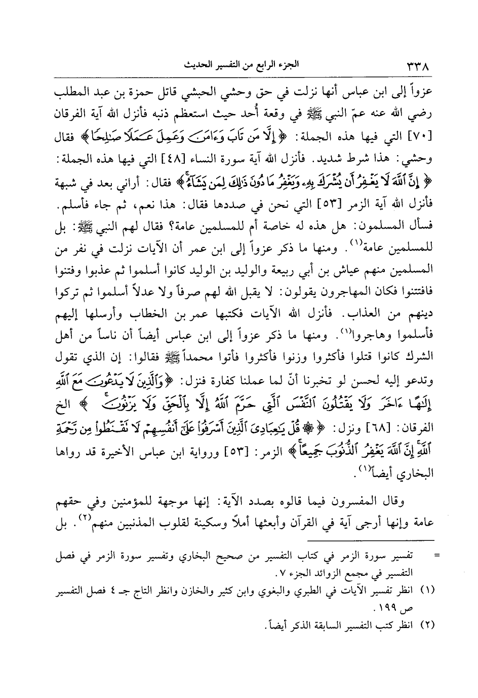 فسأل المسلمون: هل هذه له خاصة أم للمسلمين عامة؟ فقال لهم النبي صلى الله عليه وسلم: بل للمسلمين عامة «1» . ومنها ما ذكر عزوا إلى ابن عمر أن الآيات نزلت في نفر من المسلمين منهم عياش بن أبي ربيعة والوليد بن الوليد كانوا أسلموا ثم عذبوا وفتنوا فافتتنوا فكان المهاجرون يقولون: لا يقبل الله لهم صرفا ولا عدلا أسلموا ثم تركوا دينهم من العذاب. فأنزل الله الآيات فكتبها عمر بن الخطاب وأرسلها إليهم فأسلموا وهاجروا «2» . ومنها ما ذكر عزوا إلى ابن عباس أيضا أن ناسا من أهل الشرك كانوا قتلوا فأكثروا وزنوا فأكثروا فأتوا محمدا صلى الله عليه وسلم فقالوا: إن الذي تقول وتدعو إليه لحسن لو تخبرنا أنّ لما عملنا كفارة فنزل: وَالَّذِينَ لا يَدْعُونَ مَعَ اللَّهِ إِلهاً آخَرَ وَلا يَقْتُلُونَ النَّفْسَ الَّتِي حَرَّمَ اللَّهُ إِلَّا بِالْحَقِّ وَلا يَزْنُونَ إلخ الفرقان: [68] ونزل: قُلْ يا عِبادِيَ الَّذِينَ أَسْرَفُوا عَلى أَنْفُسِهِمْ لا تَقْنَطُوا مِنْ رَحْمَةِ اللَّهِ إِنَّ اللَّهَ يَغْفِرُ الذُّنُوبَ جَمِيعاً الزمر: [53] ورواية ابن عباس الأخيرة قد رواها البخاري أيضا «3» .