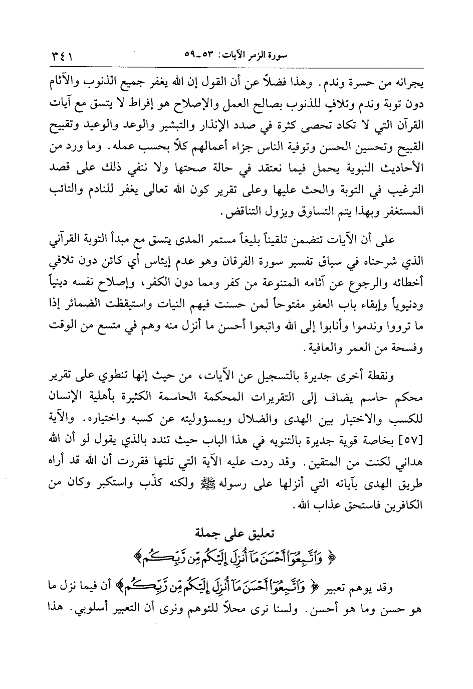 تعليق على جملة وَاتَّبِعُوا أَحْسَنَ ما أُنْزِلَ إِلَيْكُمْ مِنْ رَبِّكُمْ