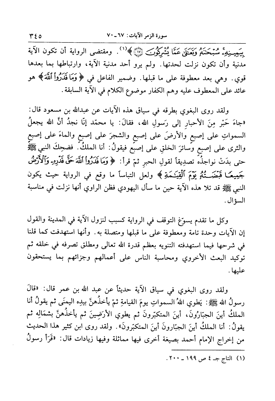 ولقد روى البغوي في سياق الآية حديثا عن عبد الله بن عمر قال: «قال رسول الله صلى الله عليه وسلم: يطوي الله السموات يوم القيامة ثمّ يأخذهنّ بيده اليمنى ثم يقول أنا الملك أين الجبّارون، أين المتكبّرون ثم يطوي الأرضين ثم يأخذهنّ بشماله ثم يقول: أنا الملك أين الجبّارون أين المتكبّرون» . ولقد روى ابن كثير هذا الحديث من إخراج الإمام أحمد بصيغة أخرى فيها مماثلة وفيها زيادات قال: «قرأ رسول