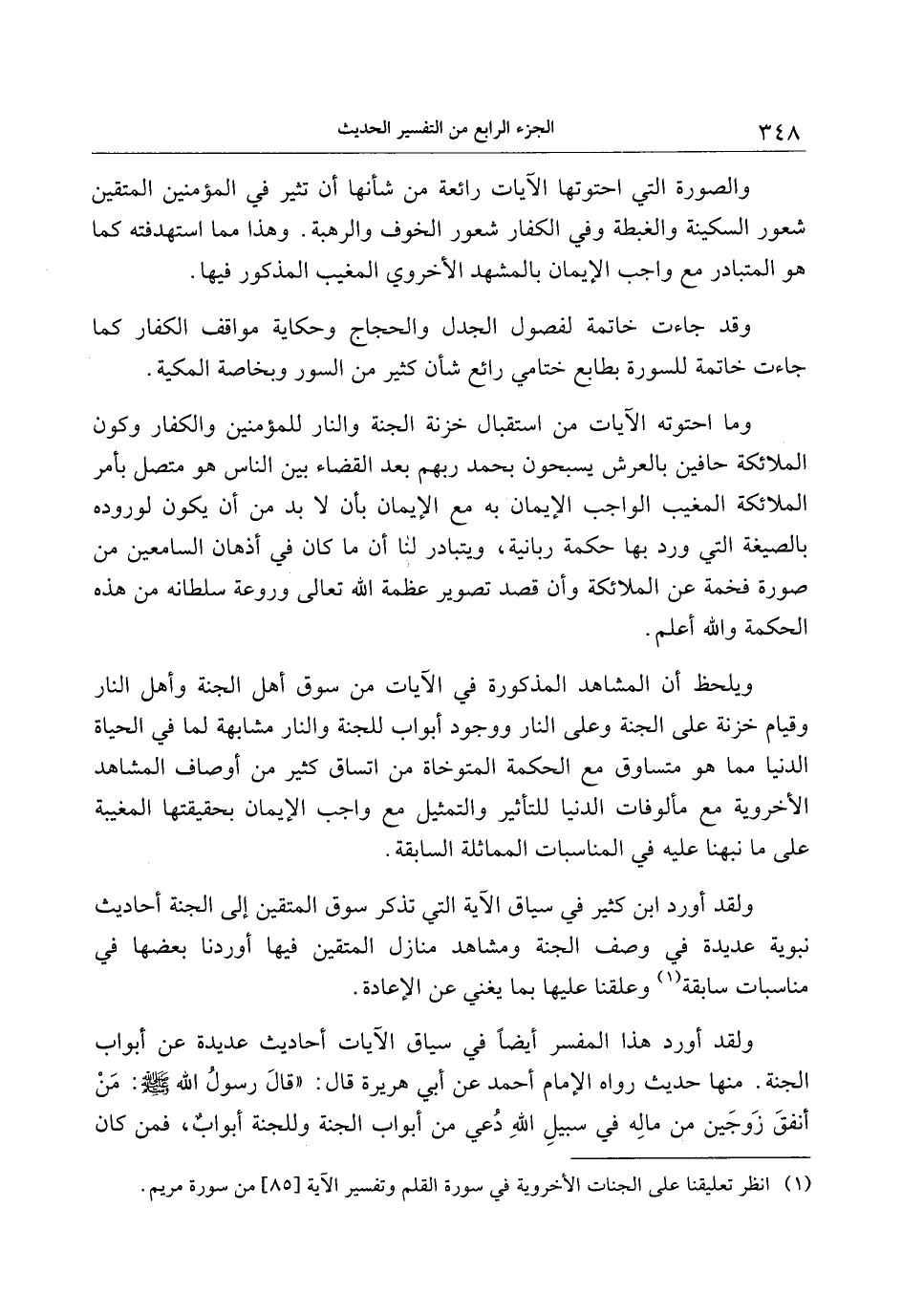 ولقد أورد ابن كثير في سياق الآية التي تذكر سوق المتقين إلى الجنة أحاديث نبوية عديدة في وصف الجنة ومشاهد منازل المتقين فيها أوردنا بعضها في مناسبات سابقة «1» وعلقنا عليها بما يغني عن الإعادة.