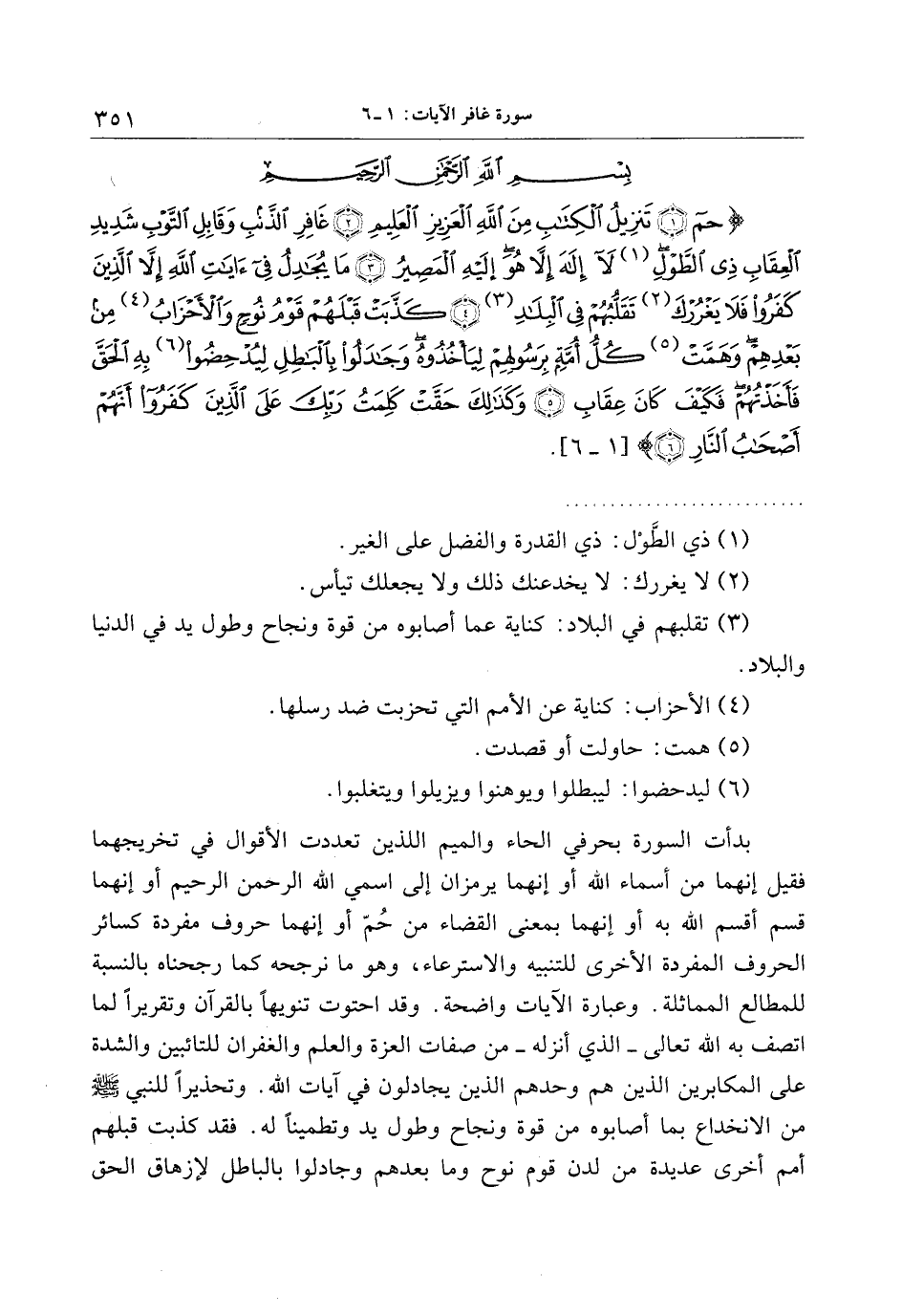 بدأت السورة بحرفي الحاء والميم اللذين تعددت الأقوال في تخريجهما فقيل إنهما من أسماء الله أو إنهما يرمزان إلى اسمي الله الرحمن الرحيم أو إنهما قسم أقسم الله به أو إنهما بمعنى القضاء من حمّ أو إنهما حروف مفردة كسائر الحروف المفردة الأخرى للتنبيه والاسترعاء، وهو ما نرجحه كما رجحناه بالنسبة للمطالع المماثلة. وعبارة الآيات واضحة. وقد احتوت تنويها بالقرآن وتقريرا لما اتصف به الله تعالى- الذي أنزله- من صفات العزة والعلم والغفران للتائبين والشدة على المكابرين الذين هم وحدهم الذين يجادلون في آيات الله. وتحذيرا للنبي صلى الله عليه وسلم من الانخداع بما أصابوه من قوة ونجاح وطول يد وتطمينا له. فقد كذبت قبلهم أمم أخرى عديدة من لدن قوم نوح وما بعدهم وجادلوا بالباطل لإزهاق الحق