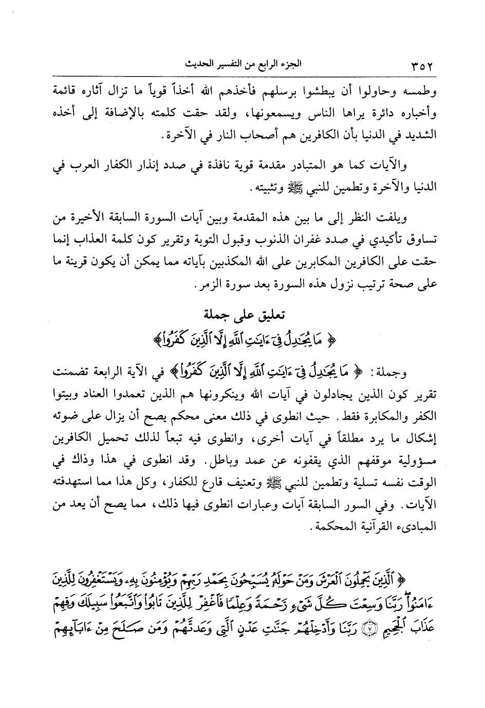 وجملة: ما يُجادِلُ فِي آياتِ اللَّهِ إِلَّا الَّذِينَ كَفَرُوا في الآية الرابعة تضمنت تقرير كون الذين يجادلون في آيات الله وينكرونها هم الذين تعمدوا العناد وبيتوا الكفر والمكابرة فقط. حيث انطوى في ذلك معنى محكم يصح أن يزال على ضوئه إشكال ما يرد مطلقا في آيات أخرى، وانطوى فيه تبعا لذلك تحميل الكافرين مسؤولية موقفهم الذي يقفونه عن عمد وباطل. وقد انطوى في هذا وذاك في الوقت نفسه تسلية وتطمين للنبي صلى الله عليه وسلم وتعنيف قارع للكفار، وكل هذا مما استهدفته الآيات. وفي السور السابقة آيات وعبارات انطوى فيها ذلك، مما يصح أن يعد من المبادئ القرآنية المحكمة.