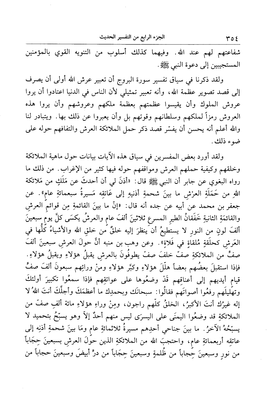 ولقد ذكرنا في سياق تفسير سورة البروج أن تعبير عرش الله أولى أن يصرف إلى قصد تصوير عظمة الله، وأنه تعبير تمثيلي لأن الناس في الدنيا اعتادوا أن يروا عروش الملوك وأن يقيسوا عظمتهم بعظمة ملكهم وعروشهم وأن يروا هذه العروش رمزا لملكهم وسلطانهم وقوتهم بل وأن يعبروا عن ذلك بها. ويتبادر لنا والله أعلم أنه يحسن أن يفسّر قصد ذكر حمل الملائكة العرش والتفافهم حوله على ضوء ذلك.