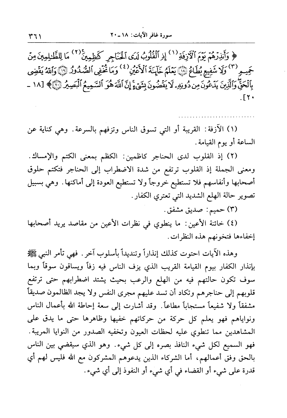 وَأَنْذِرْهُمْ يَوْمَ الْآزِفَةِ إِذِ الْقُلُوبُ لَدَى الْحَناجِرِ كاظِمِينَ ما لِلظَّالِمِينَ مِنْ حَمِيمٍ وَلا شَفِيعٍ يُطاعُ (18) يَعْلَمُ خائِنَةَ الْأَعْيُنِ وَما تُخْفِي الصُّدُورُ (19) وَاللَّهُ يَقْضِي بِالْحَقِّ وَالَّذِينَ يَدْعُونَ مِنْ دُونِهِ لا يَقْضُونَ بِشَيْءٍ إِنَّ اللَّهَ هُوَ السَّمِيعُ الْبَصِيرُ (20)