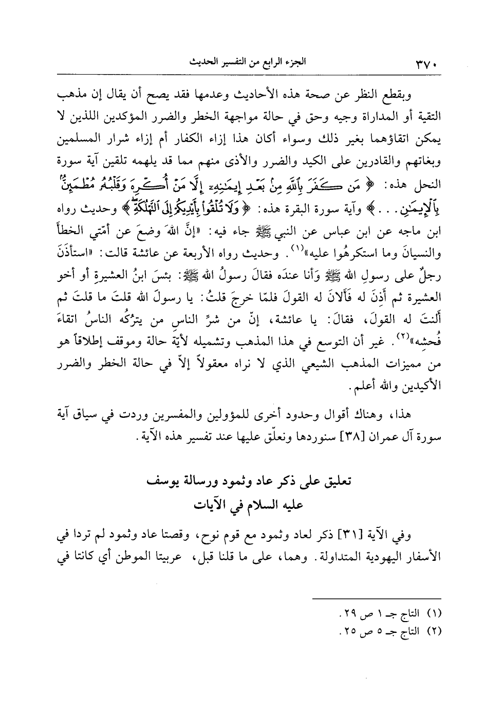 وبقطع النظر عن صحة هذه الأحاديث وعدمها فقد يصح أن يقال إن مذهب التقية أو المداراة وجيه وحق في حالة مواجهة الخطر والضرر المؤكدين اللذين لا يمكن اتقاؤهما بغير ذلك وسواء أكان هذا إزاء الكفار أم إزاء شرار المسلمين وبغاتهم والقادرين على الكيد والضرر والأذى منهم مما قد يلهمه تلقين آية سورة النحل هذه: مَنْ كَفَرَ بِاللَّهِ مِنْ بَعْدِ إِيمانِهِ إِلَّا مَنْ أُكْرِهَ وَقَلْبُهُ مُطْمَئِنٌّ بِالْإِيمانِ ... وآية سورة البقرة هذه: وَلا تُلْقُوا بِأَيْدِيكُمْ إِلَى التَّهْلُكَةِ وحديث رواه ابن ماجه عن ابن عباس عن النبي صلى الله عليه وسلم جاء فيه: «إنّ الله وضع عن أمّتي الخطأ والنسيان وما استكرهوا عليه» «1» . وحديث رواه الأربعة عن عائشة قالت: «استأذن رجل على رسول الله صلى الله عليه وسلم وأنا عنده فقال رسول الله صلى الله عليه وسلم: بئس ابن العشيرة أو أخو العشيرة ثم أذن له فألان له القول فلمّا خرج قلت: يا رسول الله قلت ما قلت ثم ألنت له القول، فقال: يا عائشة، إنّ من شرّ الناس من يتركه الناس اتقاء فحشه» «2» . غير أن التوسع في هذا المذهب وتشميله لأيّة حالة وموقف إطلاقا هو من مميزات المذهب الشيعي الذي لا نراه معقولا إلّا في حالة الخطر والضرر الأكيدين والله أعلم.