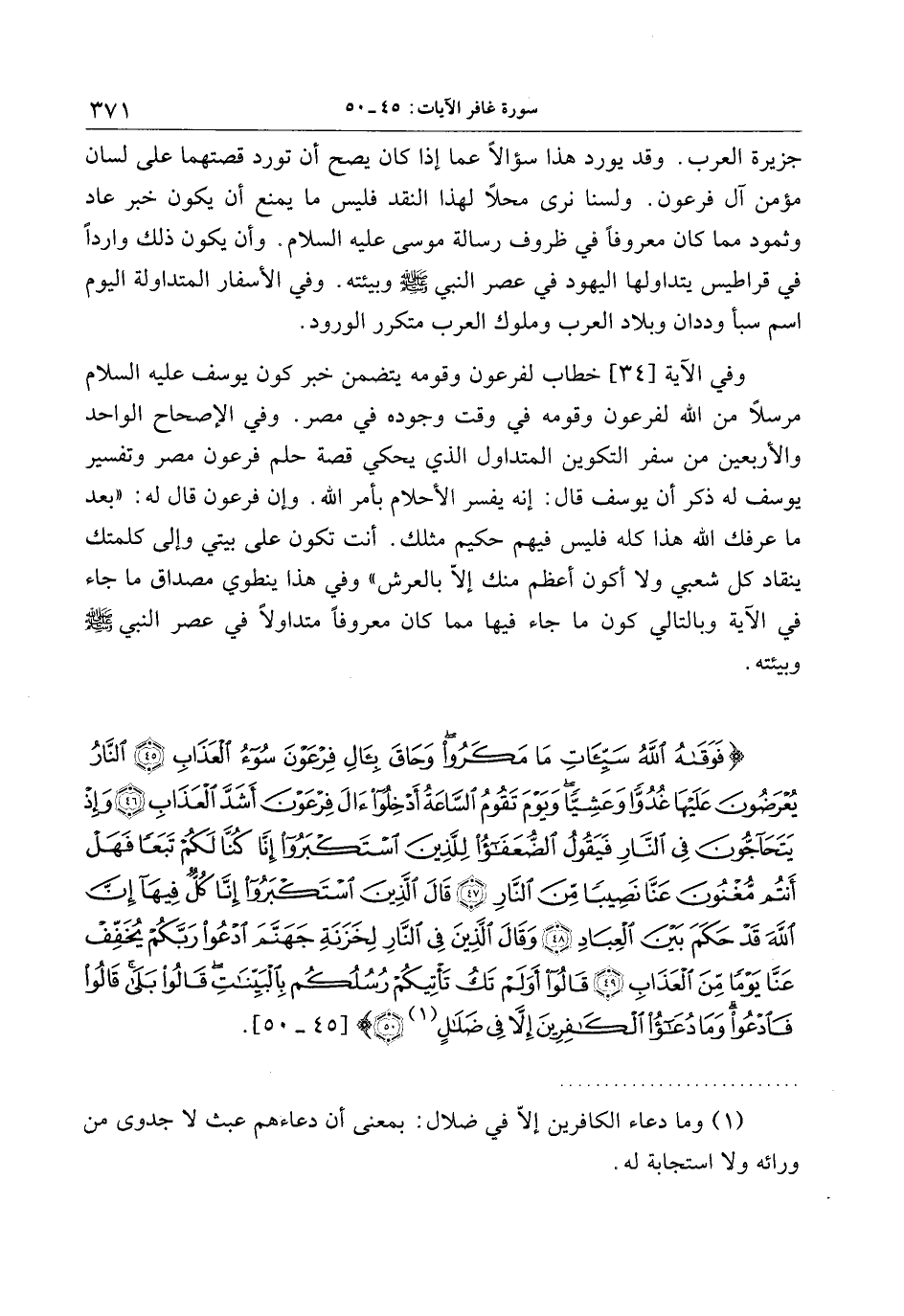 جزيرة العرب. وقد يورد هذا سؤالا عما إذا كان يصح أن تورد قصتهما على لسان مؤمن آل فرعون. ولسنا نرى محلا لهذا النقد فليس ما يمنع أن يكون خبر عاد وثمود مما كان معروفا في ظروف رسالة موسى عليه السلام. وأن يكون ذلك واردا في قراطيس يتداولها اليهود في عصر النبي صلى الله عليه وسلم وبيئته. وفي الأسفار المتداولة اليوم اسم سبأ وددان وبلاد العرب وملوك العرب متكرر الورود.