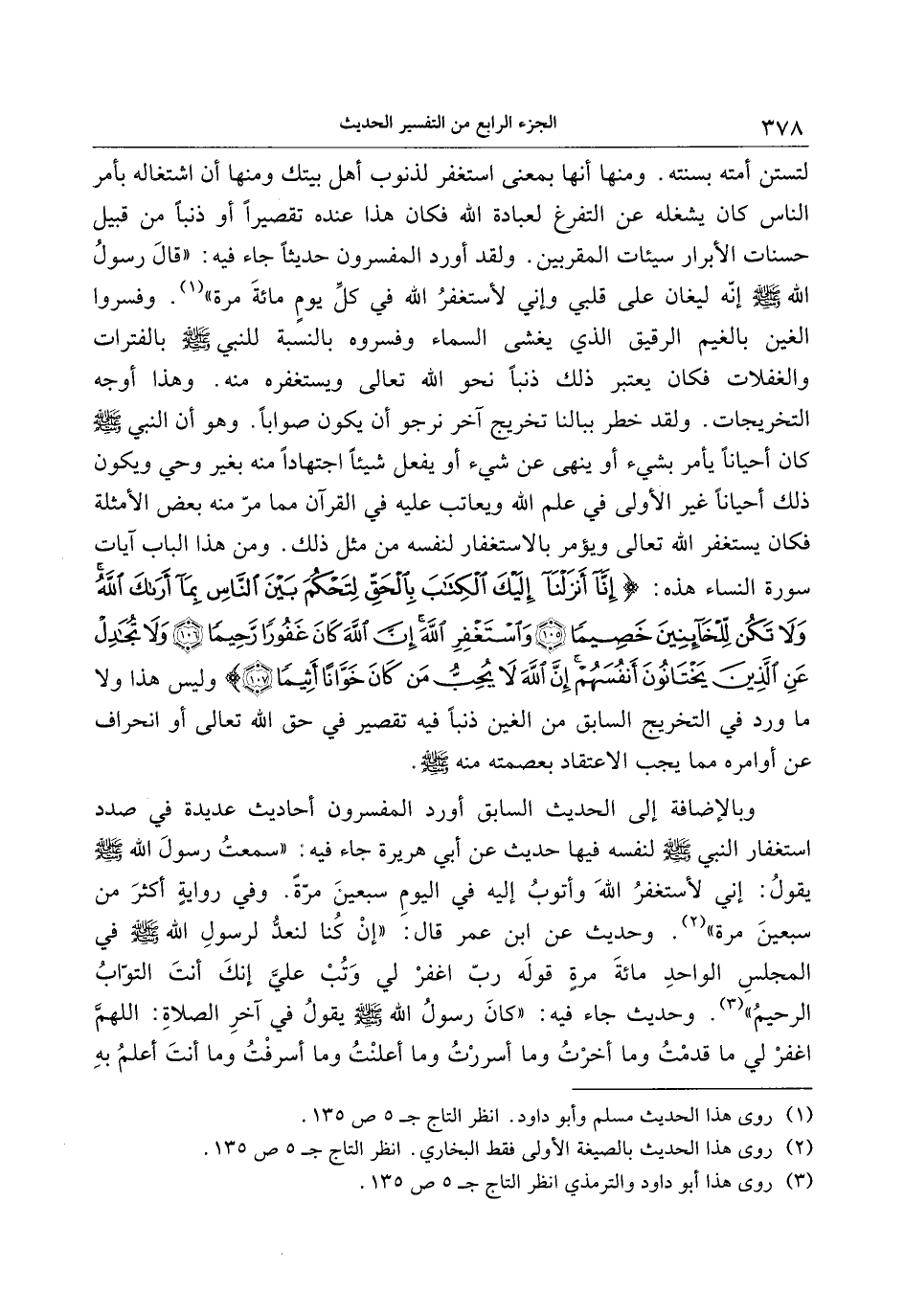 لتستن أمته بسنته. ومنها أنها بمعنى استغفر لذنوب أهل بيتك ومنها أن اشتغاله بأمر الناس كان يشغله عن التفرغ لعبادة الله فكان هذا عنده تقصيرا أو ذنبا من قبيل حسنات الأبرار سيئات المقربين. ولقد أورد المفسرون حديثا جاء فيه: «قال رسول الله صلى الله عليه وسلم إنّه ليغان على قلبي وإني لأستغفر الله في كلّ يوم مائة مرة» «1» . وفسروا الغين بالغيم الرقيق الذي يغشى السماء وفسروه بالنسبة للنبي صلى الله عليه وسلم بالفترات والغفلات فكان يعتبر ذلك ذنبا نحو الله تعالى ويستغفره منه. وهذا أوجه التخريجات. ولقد خطر ببالنا تخريج آخر نرجو أن يكون صوابا. وهو أن النبي صلى الله عليه وسلم كان أحيانا يأمر بشيء أو ينهى عن شيء أو يفعل شيئا اجتهادا منه بغير وحي ويكون ذلك أحيانا غير الأولى في علم الله ويعاتب عليه في القرآن مما مرّ منه بعض الأمثلة فكان يستغفر الله تعالى ويؤمر بالاستغفار لنفسه من مثل ذلك. ومن هذا الباب آيات سورة النساء هذه: إِنَّا أَنْزَلْنا إِلَيْكَ الْكِتابَ بِالْحَقِّ لِتَحْكُمَ بَيْنَ النَّاسِ بِما أَراكَ اللَّهُ وَلا تَكُنْ لِلْخائِنِينَ خَصِيماً (105) وَاسْتَغْفِرِ اللَّهَ إِنَّ اللَّهَ كانَ غَفُوراً رَحِيماً (106) وَلا تُجادِلْ عَنِ الَّذِينَ يَخْتانُونَ أَنْفُسَهُمْ إِنَّ اللَّهَ لا يُحِبُّ مَنْ كانَ خَوَّاناً أَثِيماً (107) وليس هذا ولا ما ورد في التخريج السابق من الغين ذنبا فيه تقصير في حق الله تعالى أو انحراف عن أوامره مما يجب الاعتقاد بعصمته منه صلى الله عليه وسلم.