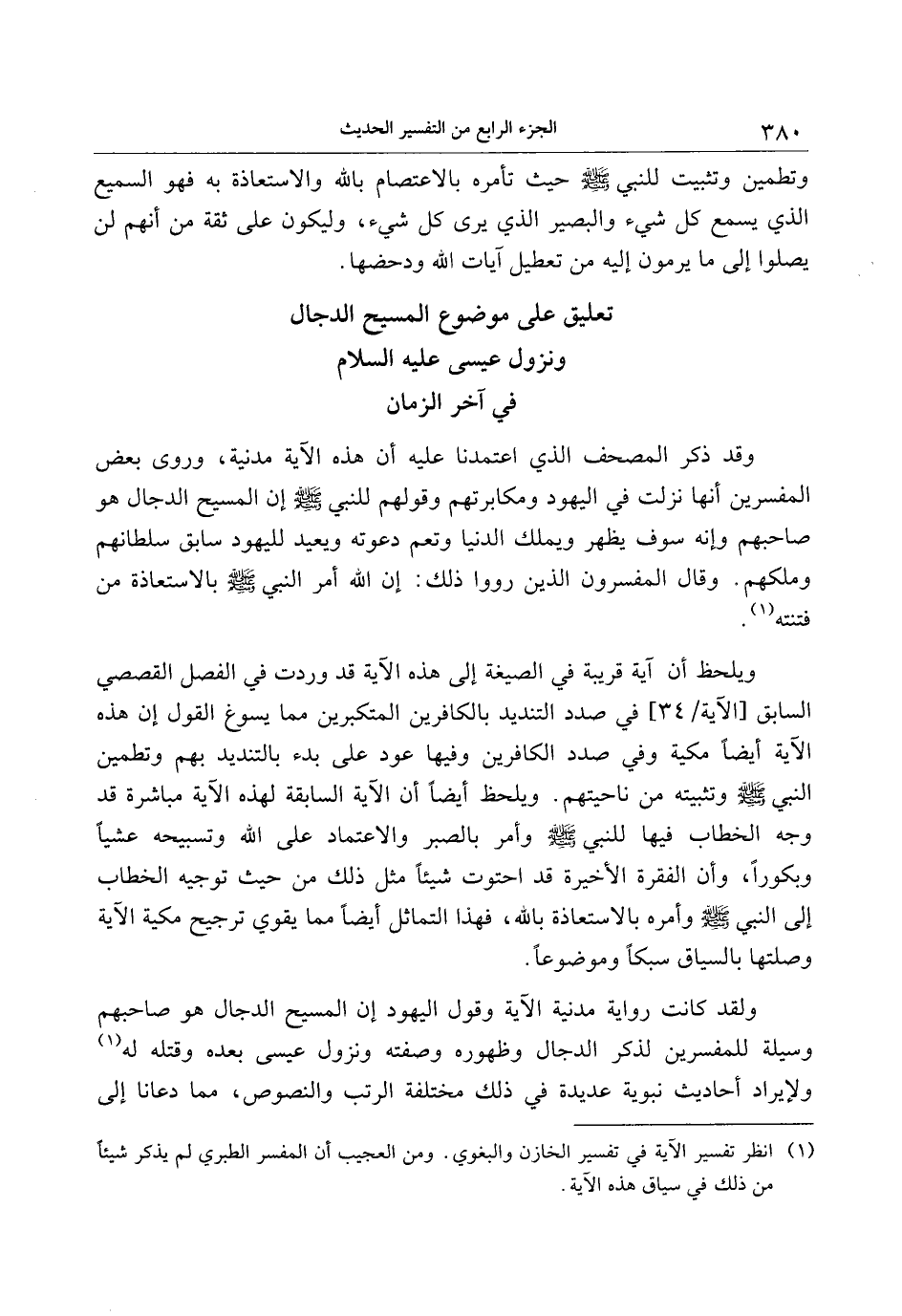 ولقد كانت رواية مدنية الآية وقول اليهود إن المسيح الدجال هو صاحبهم وسيلة للمفسرين لذكر الدجال وظهوره وصفته ونزول عيسى بعده وقتله له «2» ولإيراد أحاديث نبوية عديدة في ذلك مختلفة الرتب والنصوص، مما دعانا إلى