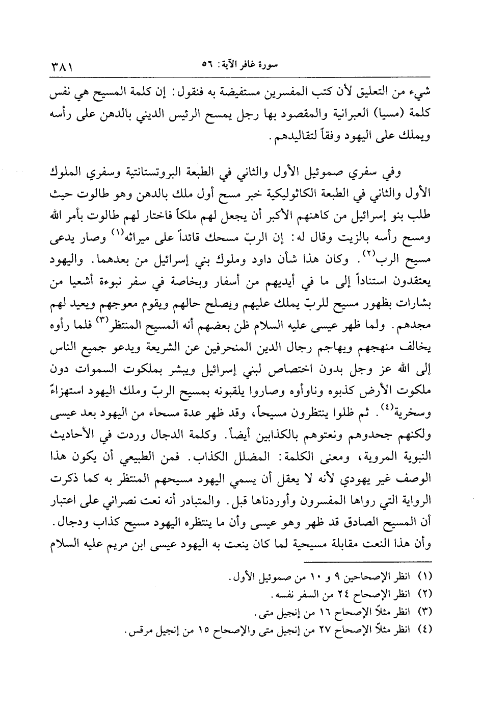 وصار يدعى مسيح الرب «2» . وكان هذا شأن داود وملوك بني إسرائيل من بعدهما. واليهود يعتقدون استنادا إلى ما في أيديهم من أسفار وبخاصة في سفر نبوءة أشعيا من بشارات بظهور مسيح للربّ يملك عليهم ويصلح حالهم ويقوم معوجهم ويعيد لهم مجدهم. ولما ظهر عيسى عليه السلام ظن بعضهم أنه المسيح المنتظر «3» فلما رأوه يخالف منهجهم ويهاجم رجال الدين المنحرفين عن الشريعة ويدعو جميع الناس إلى الله عز وجل بدون اختصاص لبني إسرائيل ويبشر بملكوت السموات دون ملكوت الأرض كذبوه وناوأوه وصاروا يلقبونه بمسيح الربّ وملك اليهود استهزاء وسخرية «4» . ثم ظلوا ينتظرون مسيحا، وقد ظهر عدة مسحاء من اليهود بعد عيسى ولكنهم جحدوهم ونعتوهم بالكذابين أيضا. وكلمة الدجال وردت في الأحاديث النبوية المروية، ومعنى الكلمة: المضلل الكذاب. فمن الطبيعي أن يكون هذا الوصف غير يهودي لأنه لا يعقل أن يسمي اليهود مسيحهم المنتظر به كما ذكرت الرواية التي رواها المفسرون وأوردناها قبل. والمتبادر أنه نعت نصراني على اعتبار أن المسيح الصادق قد ظهر وهو عيسى وأن ما ينتظره اليهود مسيح كذاب ودجال.