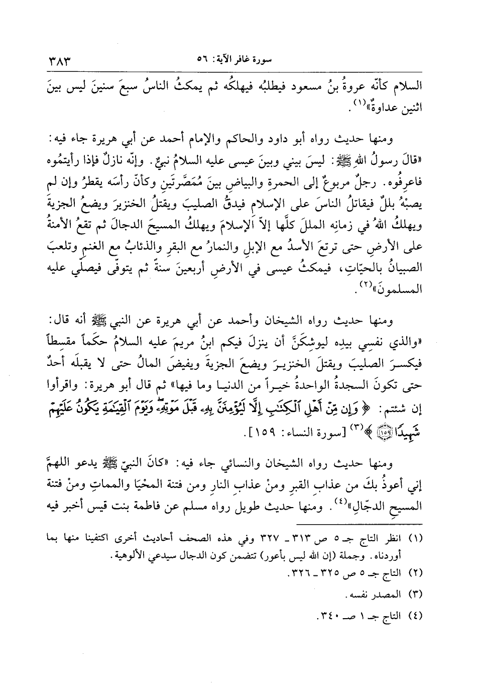 «والذي نفسي بيده ليوشكنّ أن ينزل فيكم ابن مريم عليه السلام حكما مقسطا فيكسر الصليب ويقتل الخنزير ويضع الجزية ويفيض المال حتى لا يقبله أحد حتى تكون السجدة الواحدة خيرا من الدنيا وما فيها» ثم قال أبو هريرة: واقرأوا إن شئتم: وَإِنْ مِنْ أَهْلِ الْكِتابِ إِلَّا لَيُؤْمِنَنَّ بِهِ قَبْلَ مَوْتِهِ وَيَوْمَ الْقِيامَةِ يَكُونُ عَلَيْهِمْ شَهِيداً (159) «3» [سورة النساء: 159] .