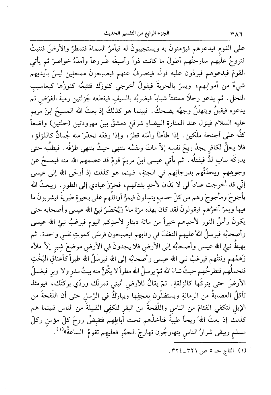 على القوم فيدعوهم فيؤمنون به ويستجيبون له فيأمر السماء فتمطر والأرض فتنبت فتروح عليهم سارحتهم أطول ما كانت ذرا وأسبغه ضروعا وأمدّه خواصر ثم يأتي القوم فيدعوهم فيردّون عليه قوله فينصرف عنهم فيصبحون ممحلين ليس بأيديهم شيء من أموالهم، ويمرّ بالخربة فيقول أخرجي كنوزك فتتبعه كنوزها كيعاسيب النحل. ثم يدعو رجلا ممتلئا شبابا فيضربه بالسيف فيقطعه جزلتين رمية الغرض ثم يدعوه فيقبل ويتهلّل وجهه يضحك. فبينما هو كذلك إذ بعث الله المسيح ابن مريم عليه السلام فينزل عند المنارة البيضاء شرقيّ دمشق بين مهرودتين (حلتين) واضعا كفّه على أجنحة ملكين. إذا طأطأ رأسه قطر، وإذا رفعه تحدّر منه جمان كاللؤلؤ، فلا يحلّ لكافر يجد ريح نفسه إلّا مات ونفسه ينتهي حيث ينتهي طرفه. فيطلبه حتى يدركه بباب لدّ فيقتله. ثم يأتي عيسى ابن مريم قوم قد عصمهم الله منه فيمسح عن وجوههم ويحدّثهم بدرجاتهم في الجنة، فبينما هو كذلك إذ أوحى الله إلى عيسى إنّي قد أخرجت عبادا لي لا يدان لأحد بقتالهم، فحرّز عبادي إلى الطور. ويبعث الله يأجوج ومأجوج وهم من كلّ حدب ينسلون فيمرّ أوائلهم على بحيرة طبرية فيشربون ما فيها ويمرّ آخرهم فيقولون لقد كان بهذه مرّة ماء ويحصر نبيّ الله عيسى وأصحابه حتى يكون رأس الثور لأحدهم خيرا من مائة دينار لأحدكم اليوم فيرغب نبيّ الله عيسى وأصحابه فيرسل الله عليهم النغف في رقابهم فيصبحون فرسى كموت نفس واحدة. ثم يهبط نبيّ الله عيسى وأصحابه إلى الأرض فلا يجدون في الأرض موضع شبر إلّا ملأه زهمهم ونتنهم فيرغب نبي الله عيسى وأصحابه إلى الله فيرسل الله طيرا كأعناق البخت فتحملهم فتطرحهم حيث شاء الله ثمّ يرسل الله مطرا لا يكنّ منه بيت مدر ولا وبر فيغسل الأرض حتى يتركها كالزلقة. ثمّ يقال للأرض أنبتي ثمرتك وردّي بركتك، فيومئذ تأكل العصابة من الرمانة ويستظلّون بعجفها ويبارك في الرّسل حتى أن اللّقحة من الإبل لتكفي الفئام من الناس واللّقحة من البقر لتكفي القبيلة من الناس فبينما هم كذلك إذ بعث الله ريحا طيبة فتأخذهم تحت آباطهم فتقبض روح كلّ مؤمن وكلّ مسلم ويبقى شرار الناس يتهارجون تهارج الحمر فعليهم تقوم الساعة» «1» .