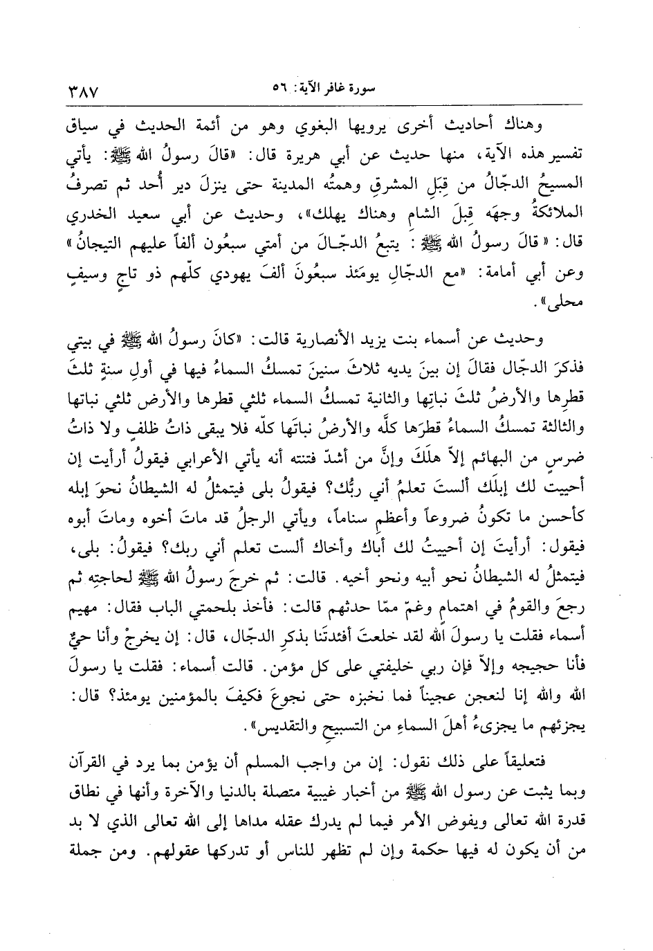 وهناك أحاديث أخرى يرويها البغوي وهو من أئمة الحديث في سياق تفسير هذه الآية، منها حديث عن أبي هريرة قال: «قال رسول الله صلى الله عليه وسلم: يأتي المسيح الدجّال من قبل المشرق وهمته المدينة حتى ينزل دير أحد ثم تصرف الملائكة وجهه قبل الشام وهناك يهلك» ، وحديث عن أبي سعيد الخدري قال: «قال رسول الله صلى الله عليه وسلم: يتبع الدجّال من أمتي سبعون ألفا عليهم التيجان» وعن أبي أمامة: «مع الدجّال يومئذ سبعون ألف يهودي كلّهم ذو تاج وسيف محلى» .