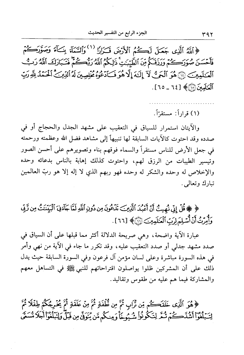 والآيتان استمرار للسياق في التعقيب على مشهد الجدل والحجاج أو في صدده وقد احتوت كالآيات السابقة لها تنبيها إلى مشاهد فضل الله وعظمته ورحمته في جعل الأرض للناس مستقرا والسماء فوقهم بناء وتصويرهم على أحسن الصور وتيسير الطيبات من الرزق لهم، واحتوت كذلك إهابة بالناس بدعائه وحده والإخلاص له وحده والشكر له وحده فهو ربهم الذي لا إله إلا هو ربّ العالمين تبارك وتعالى.