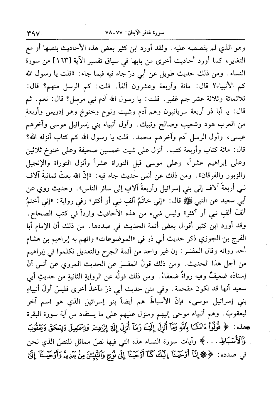وهو الذي لم يقصصه عليه. ولقد أورد ابن كثير بعض هذه الأحاديث بنصها أو مع التغاير، كما أورد أحاديث أخرى من بابها في سياق تفسير الآية [163] من سورة النساء. ومن ذلك حديث طويل عن أبي ذرّ جاء فيه فيما جاء: «قلت يا رسول الله كم الأنبياء؟ قال: مائة وأربعة وعشرون ألفا. قلت: كم الرسل منهم؟ قال: