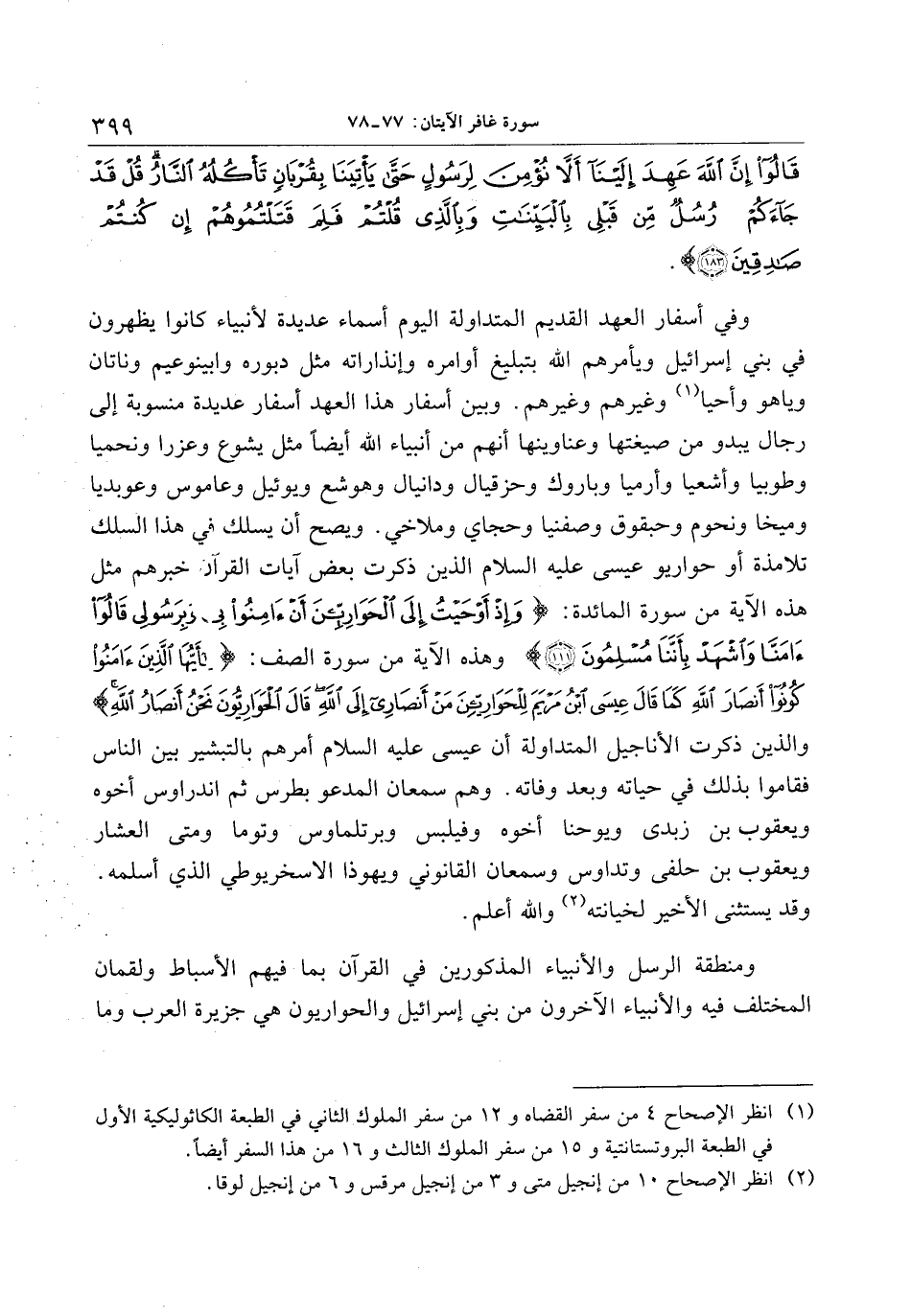 وفي أسفار العهد القديم المتداولة اليوم أسماء عديدة لأنبياء كانوا يظهرون في بني إسرائيل ويأمرهم الله بتبليغ أوامره وإنذاراته مثل دبوره وابينوعيم وناتان وياهو وأحيا «1» وغيرهم وغيرهم. وبين أسفار هذا العهد أسفار عديدة منسوبة إلى رجال يبدو من صيغتها وعناوينها أنهم من أنبياء الله أيضا مثل يشوع وعزرا ونحميا وطوبيا وأشعيا وأرميا وباروك وحزقيال ودانيال وهوشع ويوئيل وعاموس وعوبديا وميخا ونحوم وحبقوق وصفنيا وحجاي وملاخي. ويصح أن يسلك في هذا السلك تلامذة أو حواريو عيسى عليه السلام الذين ذكرت بعض آيات القرآن خبرهم مثل هذه الآية من سورة المائدة: وَإِذْ أَوْحَيْتُ إِلَى الْحَوارِيِّينَ أَنْ آمِنُوا بِي وَبِرَسُولِي قالُوا آمَنَّا وَاشْهَدْ بِأَنَّنا مُسْلِمُونَ (111) وهذه الآية من سورة الصف: يا أَيُّهَا الَّذِينَ آمَنُوا كُونُوا أَنْصارَ اللَّهِ كَما قالَ عِيسَى ابْنُ مَرْيَمَ لِلْحَوارِيِّينَ مَنْ أَنْصارِي إِلَى اللَّهِ قالَ الْحَوارِيُّونَ نَحْنُ أَنْصارُ اللَّهِ والذين ذكرت الأناجيل المتداولة أن عيسى عليه السلام أمرهم بالتبشير بين الناس فقاموا بذلك في حياته وبعد وفاته. وهم سمعان المدعو بطرس ثم اندراوس أخوه ويعقوب بن زبدى ويوحنا أخوه وفيلبس وبرتلماوس وتوما ومتى العشار ويعقوب بن حلفى وتداوس وسمعان القانوني ويهوذا الاسخريوطي الذي أسلمه.