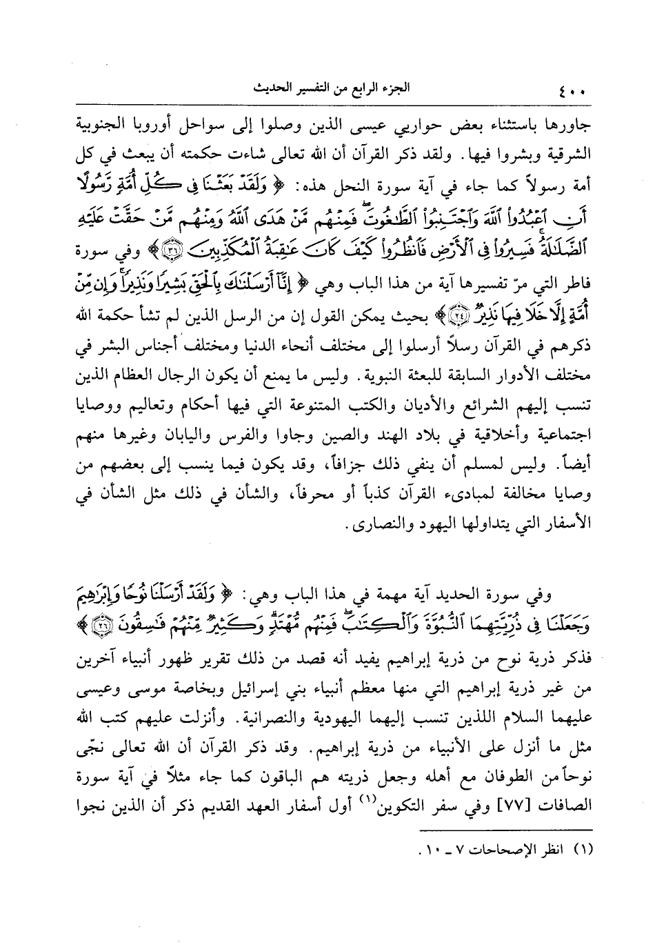 جاورها باستثناء بعض حواريي عيسى الذين وصلوا إلى سواحل أوروبا الجنوبية الشرقية وبشروا فيها. ولقد ذكر القرآن أن الله تعالى شاءت حكمته أن يبعث في كل أمة رسولا كما جاء في آية سورة النحل هذه: وَلَقَدْ بَعَثْنا فِي كُلِّ أُمَّةٍ رَسُولًا أَنِ اعْبُدُوا اللَّهَ وَاجْتَنِبُوا الطَّاغُوتَ فَمِنْهُمْ مَنْ هَدَى اللَّهُ وَمِنْهُمْ مَنْ حَقَّتْ عَلَيْهِ الضَّلالَةُ فَسِيرُوا فِي الْأَرْضِ فَانْظُرُوا كَيْفَ كانَ عاقِبَةُ الْمُكَذِّبِينَ (36) وفي سورة فاطر التي مرّ تفسيرها آية من هذا الباب وهي إِنَّا أَرْسَلْناكَ بِالْحَقِّ بَشِيراً وَنَذِيراً وَإِنْ مِنْ أُمَّةٍ إِلَّا خَلا فِيها نَذِيرٌ (24) بحيث يمكن القول إن من الرسل الذين لم تشأ حكمة الله ذكرهم في القرآن رسلا أرسلوا إلى مختلف أنحاء الدنيا ومختلف أجناس البشر في مختلف الأدوار السابقة للبعثة النبوية. وليس ما يمنع أن يكون الرجال العظام الذين تنسب إليهم الشرائع والأديان والكتب المتنوعة التي فيها أحكام وتعاليم ووصايا اجتماعية وأخلاقية في بلاد الهند والصين وجاوا والفرس واليابان وغيرها منهم أيضا. وليس لمسلم أن ينفي ذلك جزافا، وقد يكون فيما ينسب إلى بعضهم من وصايا مخالفة لمبادىء القرآن كذبا أو محرفا، والشأن في ذلك مثل الشأن في الأسفار التي يتداولها اليهود والنصارى.