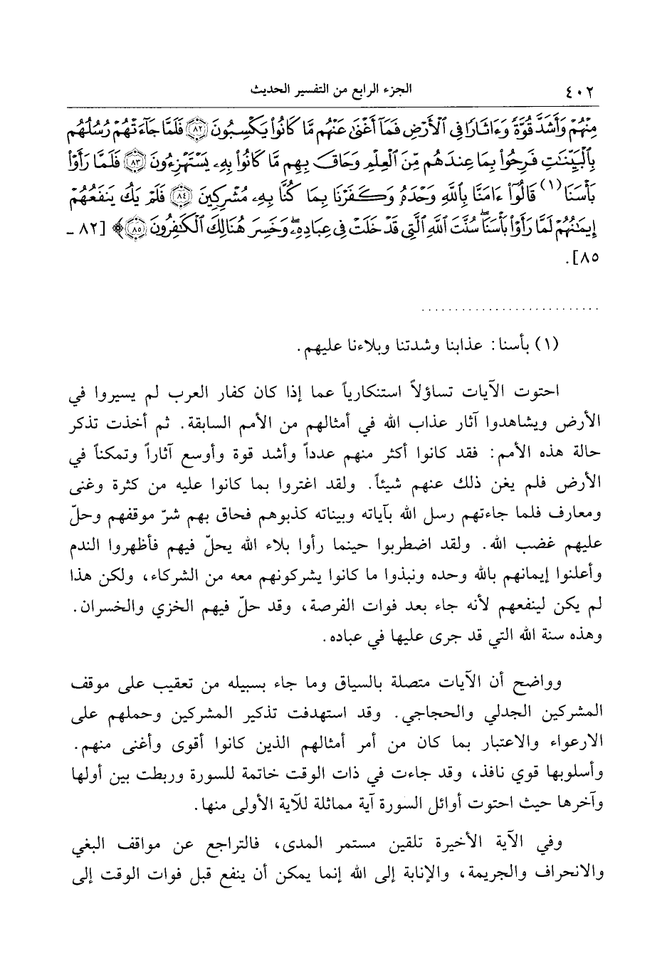 احتوت الآيات تساؤلا استنكاريا عما إذا كان كفار العرب لم يسيروا في الأرض ويشاهدوا آثار عذاب الله في أمثالهم من الأمم السابقة. ثم أخذت تذكر حالة هذه الأمم: فقد كانوا أكثر منهم عددا وأشد قوة وأوسع آثارا وتمكنا في الأرض فلم يغن ذلك عنهم شيئا. ولقد اغتروا بما كانوا عليه من كثرة وغنى ومعارف فلما جاءتهم رسل الله بآياته وبيناته كذبوهم فحاق بهم شرّ موقفهم وحلّ عليهم غضب الله. ولقد اضطربوا حينما رأوا بلاء الله يحلّ فيهم فأظهروا الندم وأعلنوا إيمانهم بالله وحده ونبذوا ما كانوا يشركونهم معه من الشركاء، ولكن هذا لم يكن لينفعهم لأنه جاء بعد فوات الفرصة، وقد حلّ فيهم الخزي والخسران.