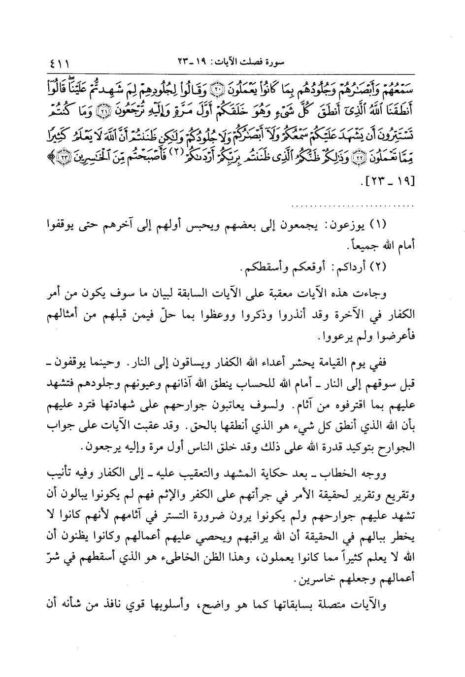 ففي يوم القيامة يحشر أعداء الله الكفار ويساقون إلى النار. وحينما يوقفون- قبل سوقهم إلى النار- أمام الله للحساب ينطق الله آذانهم وعيونهم وجلودهم فتشهد عليهم بما اقترفوه من آثام. ولسوف يعاتبون جوارحهم على شهادتها فترد عليهم بأن الله الذي أنطق كل شيء هو الذي أنطقها بالحق. وقد عقبت الآيات على جواب الجوارح بتوكيد قدرة الله على ذلك وقد خلق الناس أول مرة وإليه يرجعون.