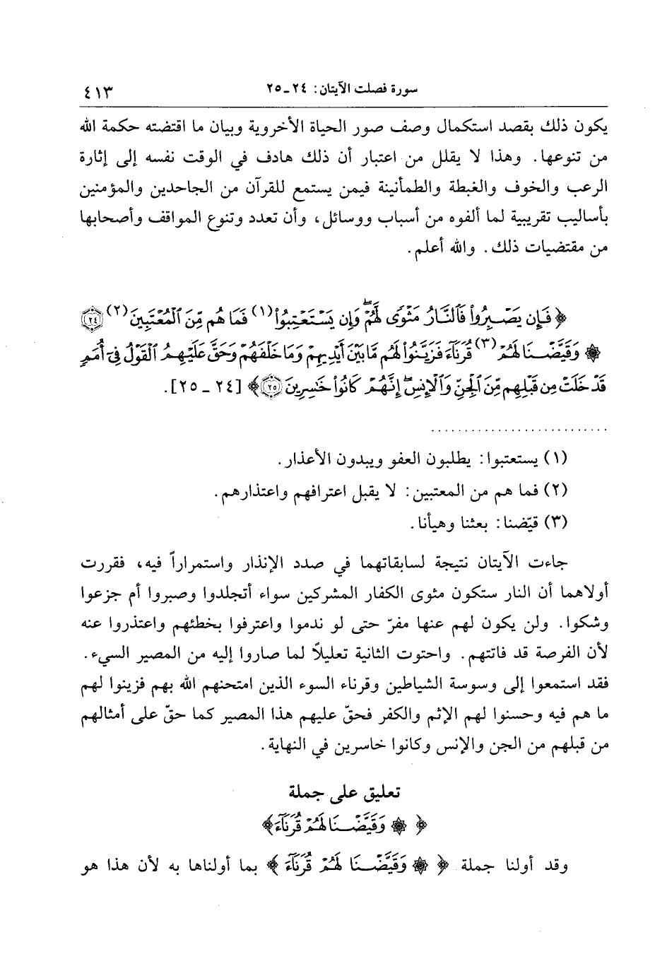 فَإِنْ يَصْبِرُوا فَالنَّارُ مَثْوىً لَهُمْ وَإِنْ يَسْتَعْتِبُوا فَما هُمْ مِنَ الْمُعْتَبِينَ (24) وَقَيَّضْنا لَهُمْ قُرَناءَ فَزَيَّنُوا لَهُمْ ما بَيْنَ أَيْدِيهِمْ وَما خَلْفَهُمْ وَحَقَّ عَلَيْهِمُ الْقَوْلُ فِي أُمَمٍ قَدْ خَلَتْ مِنْ قَبْلِهِمْ مِنَ الْجِنِّ وَالْإِنْسِ إِنَّهُمْ كانُوا خاسِرِينَ (25)