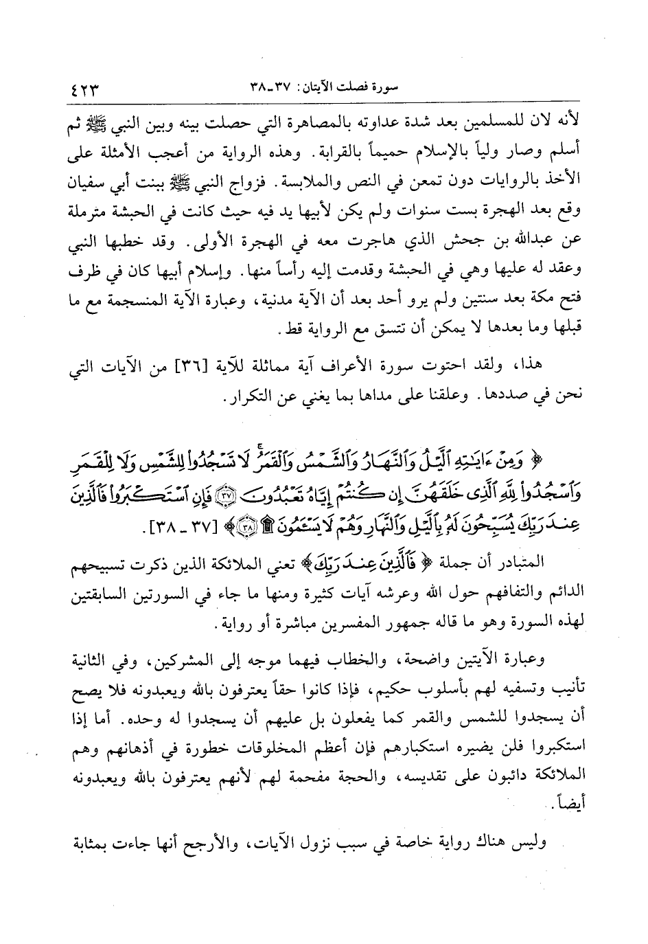 وعبارة الآيتين واضحة، والخطاب فيهما موجه إلى المشركين، وفي الثانية تأنيب وتسفيه لهم بأسلوب حكيم، فإذا كانوا حقا يعترفون بالله ويعبدونه فلا يصح أن يسجدوا للشمس والقمر كما يفعلون بل عليهم أن يسجدوا له وحده. أما إذا استكبروا فلن يضيره استكبارهم فإن أعظم المخلوقات خطورة في أذهانهم وهم الملائكة دائبون على تقديسه، والحجة مفحمة لهم لأنهم يعترفون بالله ويعبدونه أيضا.