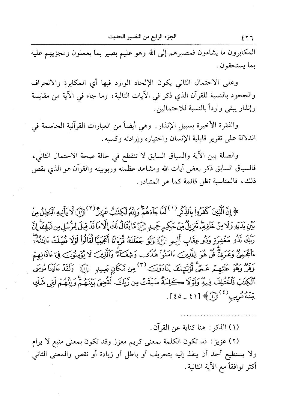 إِنَّ الَّذِينَ كَفَرُوا بِالذِّكْرِ لَمَّا جاءَهُمْ وَإِنَّهُ لَكِتابٌ عَزِيزٌ (41) لا يَأْتِيهِ الْباطِلُ مِنْ بَيْنِ يَدَيْهِ وَلا مِنْ خَلْفِهِ تَنْزِيلٌ مِنْ حَكِيمٍ حَمِيدٍ (42) ما يُقالُ لَكَ إِلاَّ ما قَدْ قِيلَ لِلرُّسُلِ مِنْ قَبْلِكَ إِنَّ رَبَّكَ لَذُو مَغْفِرَةٍ وَذُو عِقابٍ أَلِيمٍ (43) وَلَوْ جَعَلْناهُ قُرْآناً أَعْجَمِيًّا لَقالُوا لَوْلا فُصِّلَتْ آياتُهُءَ أَعْجَمِيٌّ وَعَرَبِيٌّ قُلْ هُوَ لِلَّذِينَ آمَنُوا هُدىً وَشِفاءٌ وَالَّذِينَ لا يُؤْمِنُونَ فِي آذانِهِمْ وَقْرٌ وَهُوَ عَلَيْهِمْ عَمًى أُولئِكَ يُنادَوْنَ مِنْ مَكانٍ بَعِيدٍ (44) وَلَقَدْ آتَيْنا مُوسَى الْكِتابَ فَاخْتُلِفَ فِيهِ وَلَوْلا كَلِمَةٌ سَبَقَتْ مِنْ رَبِّكَ لَقُضِيَ بَيْنَهُمْ وَإِنَّهُمْ لَفِي شَكٍّ مِنْهُ مُرِيبٍ (45)
