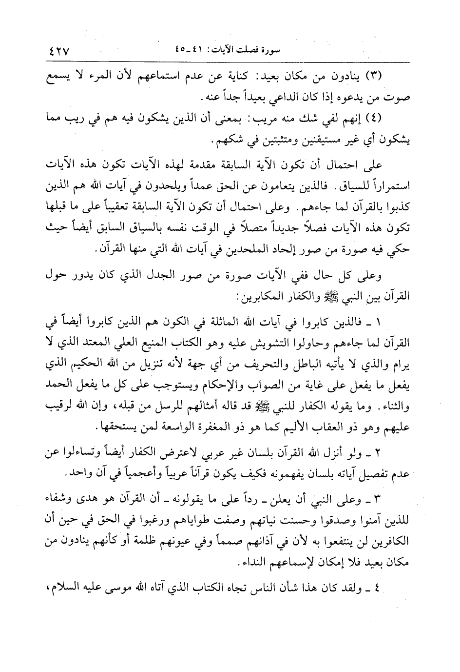 3- وعلى النبي أن يعلن- ردا على ما يقولونه- أن القرآن هو هدى وشفاء للذين آمنوا وصدقوا وحسنت نياتهم وصفت طواياهم ورغبوا في الحق في حين أن الكافرين لن ينتفعوا به لأن في آذانهم صمما وفي عيونهم ظلمة أو كأنهم ينادون من مكان بعيد فلا إمكان لإسماعهم النداء.
