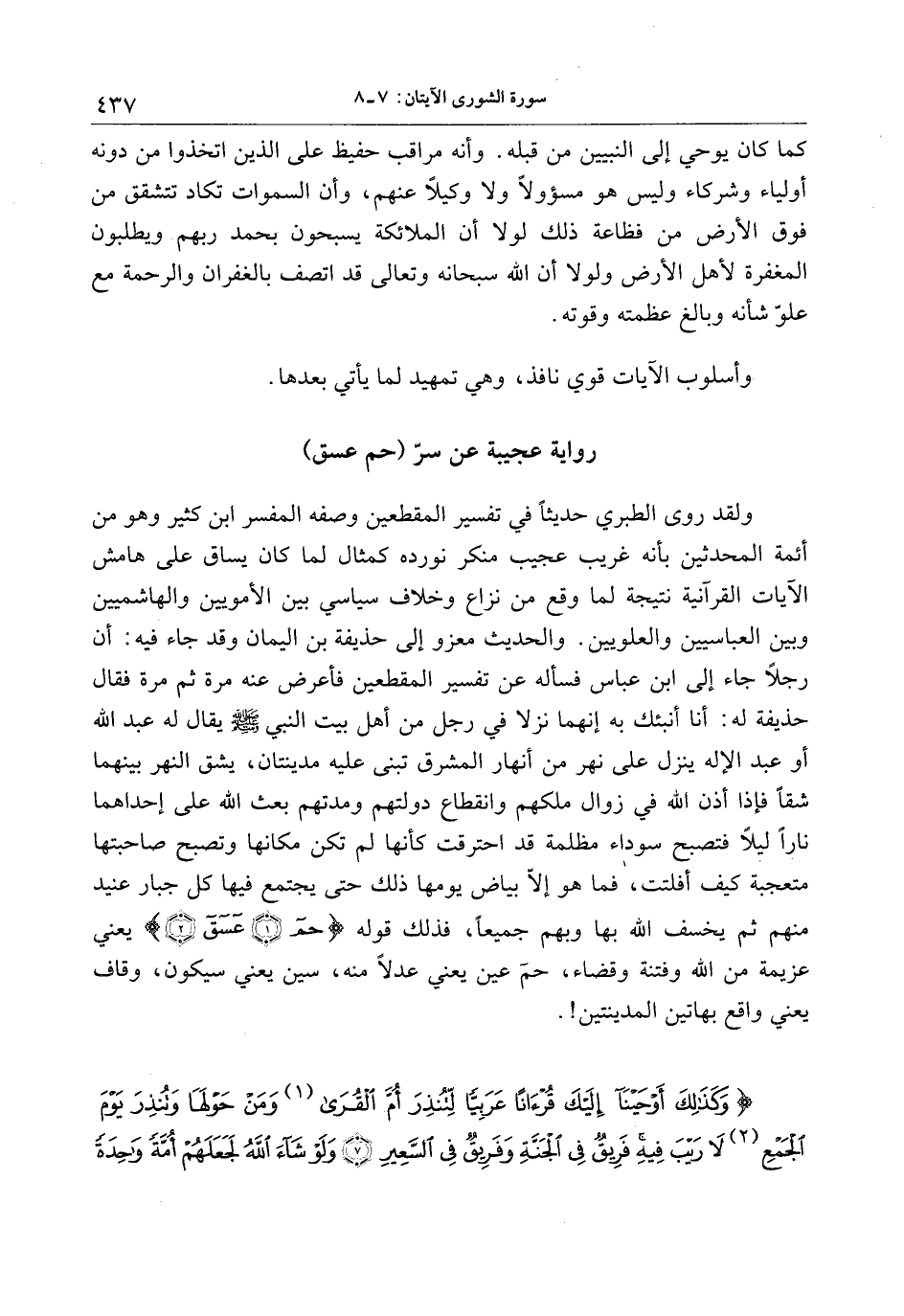 ولقد روى الطبري حديثا في تفسير المقطعين وصفه المفسر ابن كثير وهو من أئمة المحدثين بأنه غريب عجيب منكر نورده كمثال لما كان يساق على هامش الآيات القرآنية نتيجة لما وقع من نزاع وخلاف سياسي بين الأمويين والهاشميين وبين العباسيين والعلويين. والحديث معزو إلى حذيفة بن اليمان وقد جاء فيه: أن رجلا جاء إلى ابن عباس فسأله عن تفسير المقطعين فأعرض عنه مرة ثم مرة فقال حذيفة له: أنا أنبئك به إنهما نزلا في رجل من أهل بيت النبي صلى الله عليه وسلم يقال له عبد الله أو عبد الإله ينزل على نهر من أنهار المشرق تبنى عليه مدينتان، يشق النهر بينهما شقا فإذا أذن الله في زوال ملكهم وانقطاع دولتهم ومدتهم بعث الله على إحداهما نارا ليلا فتصبح سوداء مظلمة قد احترقت كأنها لم تكن مكانها وتصبح صاحبتها متعجبة كيف أفلتت، فما هو إلّا بياض يومها ذلك حتى يجتمع فيها كل جبار عنيد منهم ثم يخسف الله بها وبهم جميعا، فلذلك قوله حم (1) عسق (2) يعني عزيمة من الله وفتنة وقضاء، حم عين يعني عدلا منه، سين يعني سيكون، وقاف يعني واقع بهاتين المدينتين!.