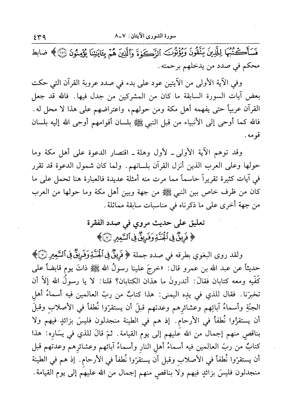 ولقد روى البغوي بطرقه في صدد جملة فَرِيقٌ فِي الْجَنَّةِ وَفَرِيقٌ فِي السَّعِيرِ (7) حديثا عن عبد الله بن عمرو قال: «خرج علينا رسول الله صلى الله عليه وسلم ذات يوم قابضا على كفّيه ومعه كتابان فقال: أتدرون ما هذان الكتابان؟ قلنا: لا يا رسول الله إلّا أن تخبرنا. فقال للذي في يده اليمنى: هذا كتاب من ربّ العالمين فيه أسماء أهل الجنّة وأسماء آبائهم وعشائرهم وعدتهم قبل أن يستقرّوا نطفا في الأصلاب وقبل أن يستقرّوا نطفا في الأرحام. إذ هم في الطينة منجدلون فليس بزائد فيهم ولا بناقص منهم إجمال من الله عليهم إلى يوم القيامة. ثمّ قال للذي في يساره: هذا كتاب من ربّ العالمين فيه أسماء أهل النار وأسماء آبائهم وعشائرهم وعدتهم قبل أن يستقرّوا نطفا في الأصلاب وقبل أن يستقرّوا نطفا في الأرحام. إذ هم في الطينة منجدلون فليس بزائد فيهم ولا بناقص منهم إجمال من الله عليهم إلى يوم القيامة.
