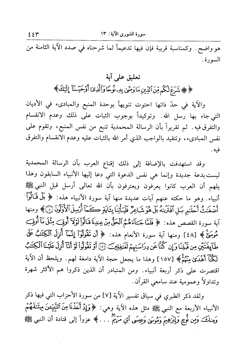 والآية في حدّ ذاتها احتوت تنويها بوحدة المنبع والمبادئ في الأديان التي جاء بها رسل الله. وتوكيدا بوجوب الثبات على ذلك وعدم الانقسام والتفرق فيه. ثم تقريرا بأن الرسالة المحمدية تنبع من نفس المنبع، وتقوم على نفس المبادئ، وتتقيد بالواجب الذي أمر الله بالثبات عليه وعدم الانقسام والتفرق فيه.