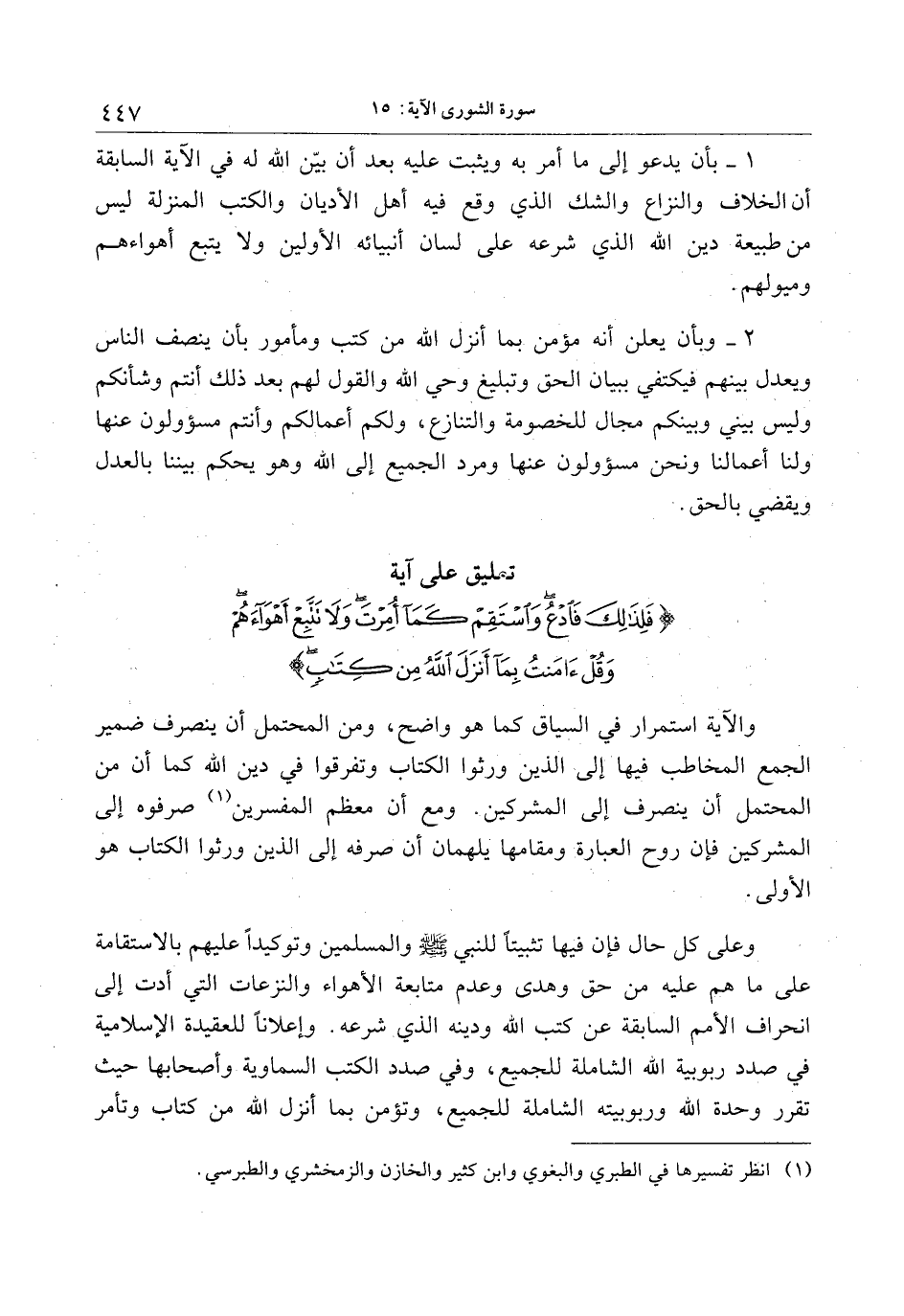 تعليق على آية فَلِذلِكَ فَادْعُ وَاسْتَقِمْ كَما أُمِرْتَ وَلا تَتَّبِعْ أَهْواءَهُمْ وَقُلْ آمَنْتُ بِما أَنْزَلَ اللَّهُ مِنْ كِتابٍ